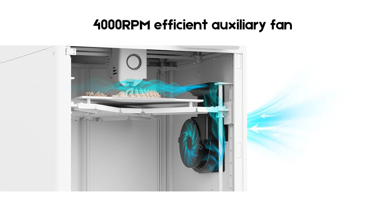 Side Cooling System: Side-mounted cooling with auxiliary fans accelerates model cooling, enhancing print quality by solving issues like stringing and warping.