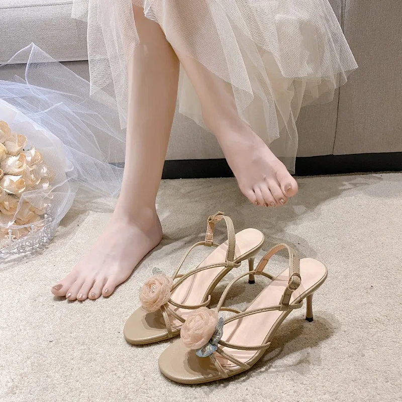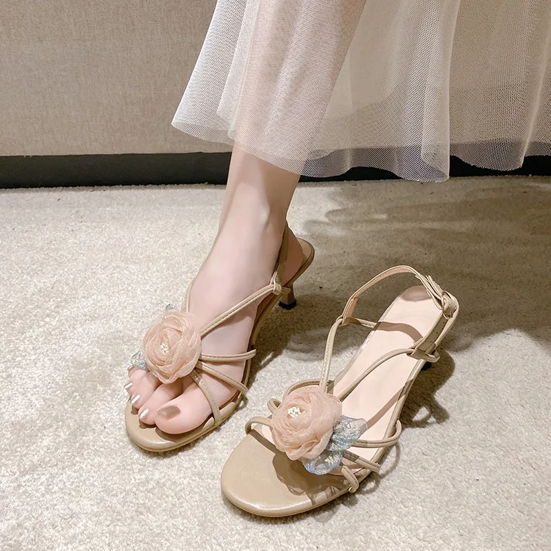 تخفيضات صيفية لعام 2025 على الأحذية النسائية صندل نسائي بكعب عالٍ وحزام بإبزيم جديد للفتيات مريح بيج بكعب عالي خنجر منخفض الأزهار