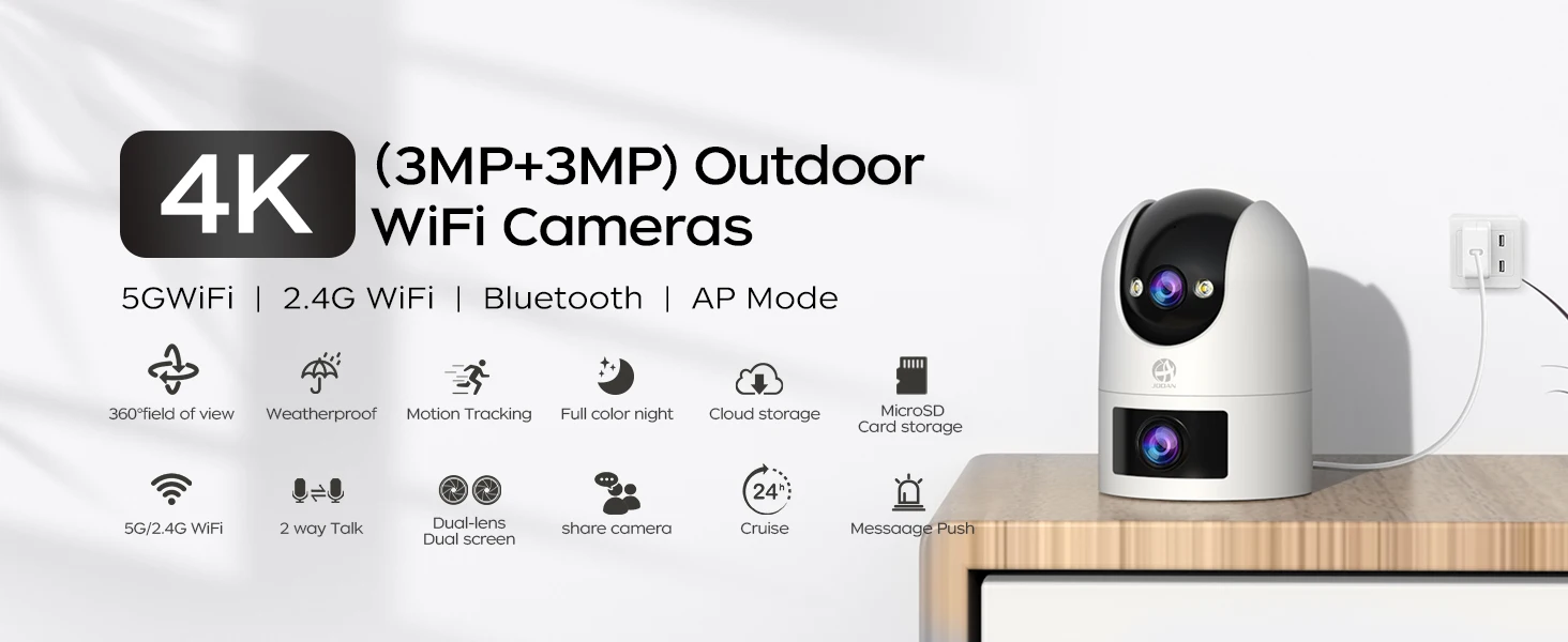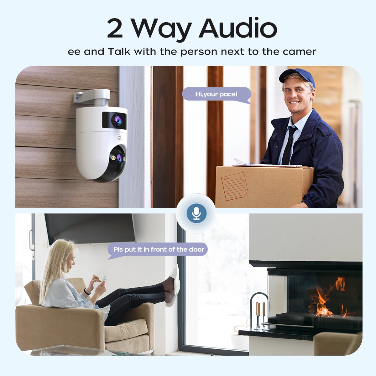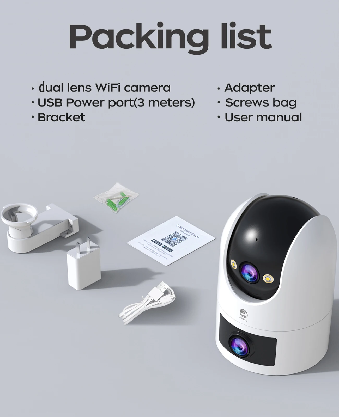 • Motion detection Smart Alert and Horizontally Auto Tracking: Motion Triggered with Alarm, APP Push notifications and Alarm recording.When top lens camera detects object moving, it will auto move follow the object.