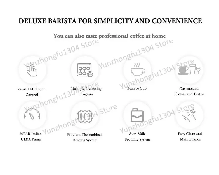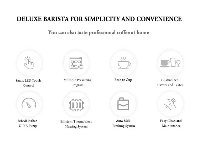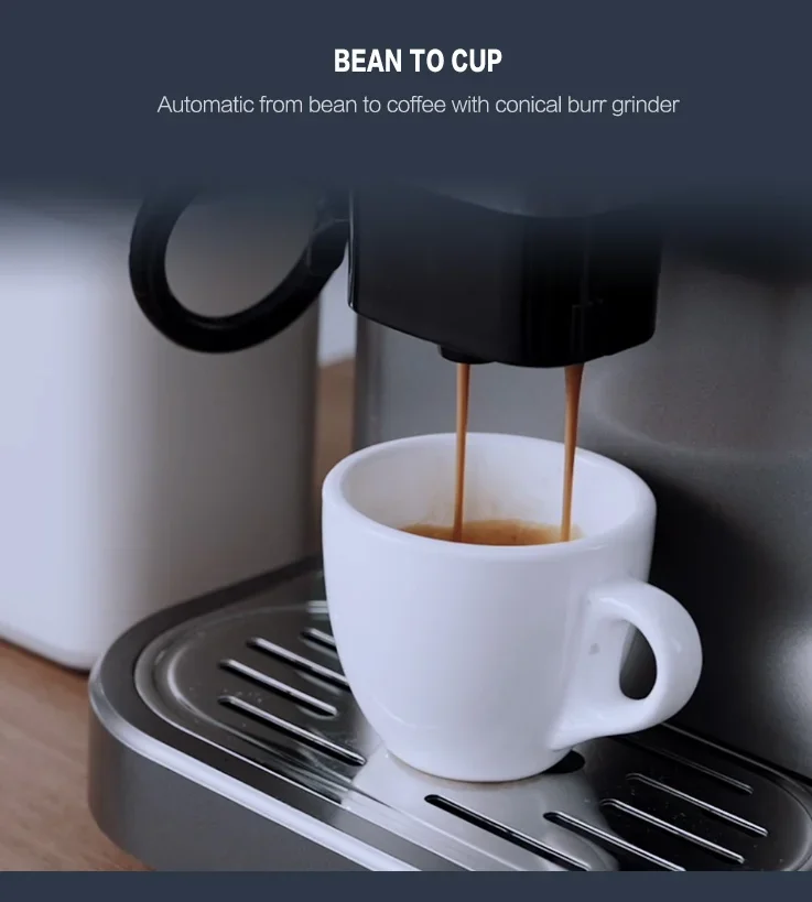 أوتوماتيكية بالكامل من الفول إلى الكوب مع مضخة ULKA الإيطالية 15BAR، ومطحنة نتوء مخروطية SS ونظام رغوة الحليب التلقائي سيفون
