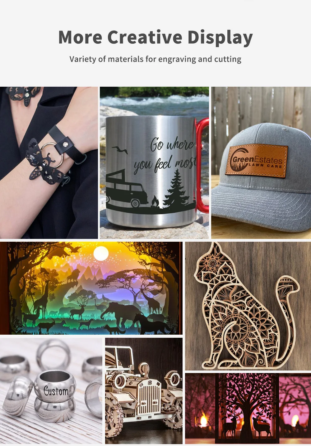 Wide Compatibility:Support mobile APP control, wifi connection, USB connection, offline USE,The machine is compatible with various mature engraving software, such as LaserGRBL, LightBurn, Benbox, GrblController, LiteFire, supports PWM mode engraving, supports Windows Mac system, and engraving file format Support JPG, PNG, DXF, SVG, G-code, NC, BMP, etc.