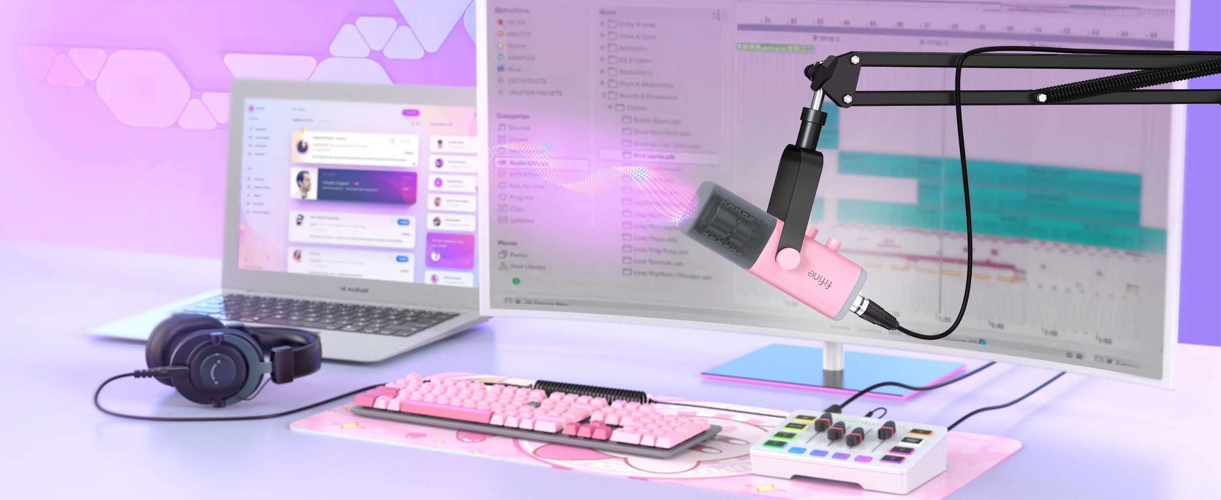 This stylish pink articulated arm microphone set is perfect for all your recording needs. With its flexible angles and adjustable height, you can easily find the perfect position for stable recording, minimizing desk vibrations while keeping your workspace tidy.