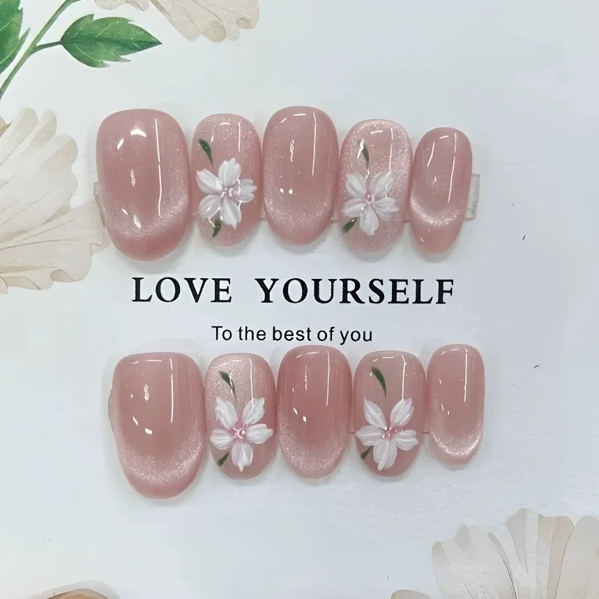 10 قطع من زهور عين القط الوردية المرسومة يدويًا، أظافر صناعية مصنوعة يدويًا، رقع تزيين أظافر قصيرة وردية للفتيات