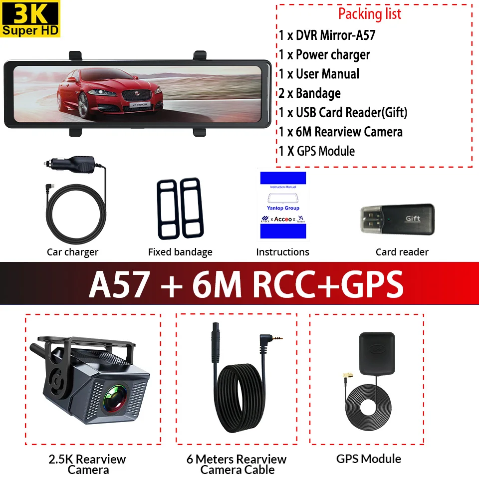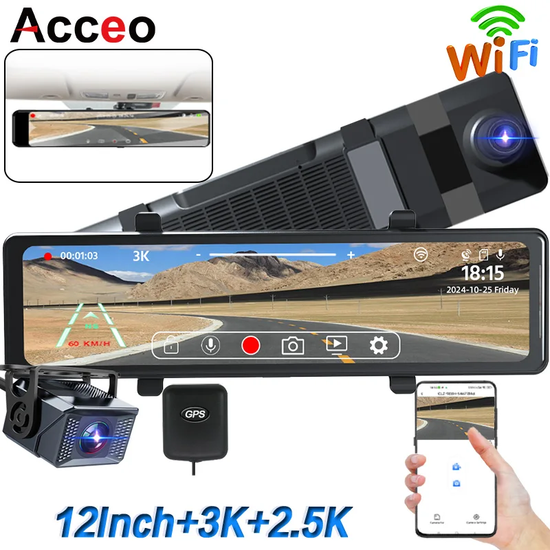 Acceo جهاز تسجيل فيديو رقمي للسيارات غرفة مرآة الرؤية الخلفية دعم الجبهة 3K و 2.5K كاميرا السيارة الخلفية صندوق أسود لتحديد المواقع واي فاي داشكام 24H مراقبة وقوف السيارات