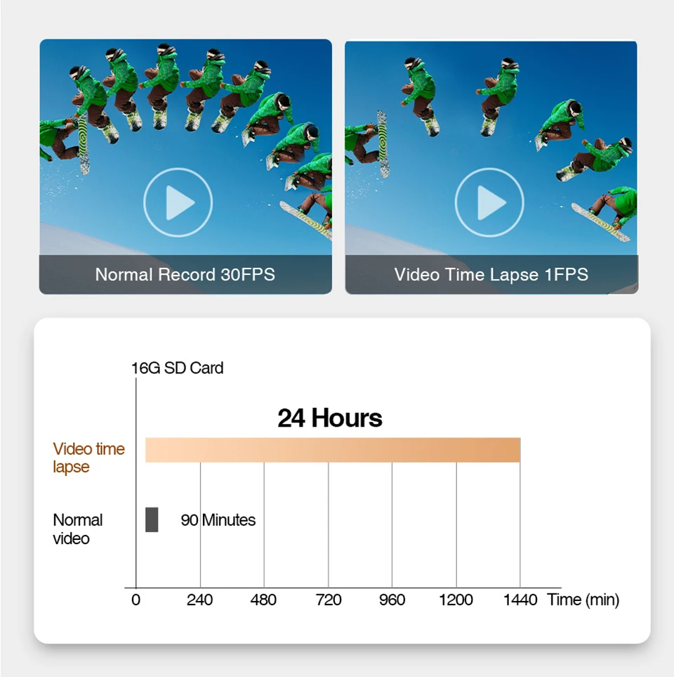 باستخدام بطاقة ذاكرة 16 جيجا كمثال، يمكن تسجيل حوالي ساعة واحدة فقط من الفيديو في وضع 30 إطارًا في الثانية.بعد تمكين وظيفة التسجيل بفاصل زمني، سيصل وقت التسجيل تحت إطار واحد في وضع الثانية إلى 30 ساعة (أكثر من 24 ساعة)، مما سيزيد من الحد الأقصى لوقت التسجيل وتخزين البيانات بمقدار 30 مرة، مما يضمن سلامة المحتوى المسجل، مما يوفر مساحة بطاقة الذاكرة بشكل كبير ويحمي سيارتك لأكثر من 24 ساعة.(ملاحظة: تحتاج إلى شراء مجموعة أسلاك صلبة، الرابط:https://www.aliexpress.com/item/1005006085796609.html)