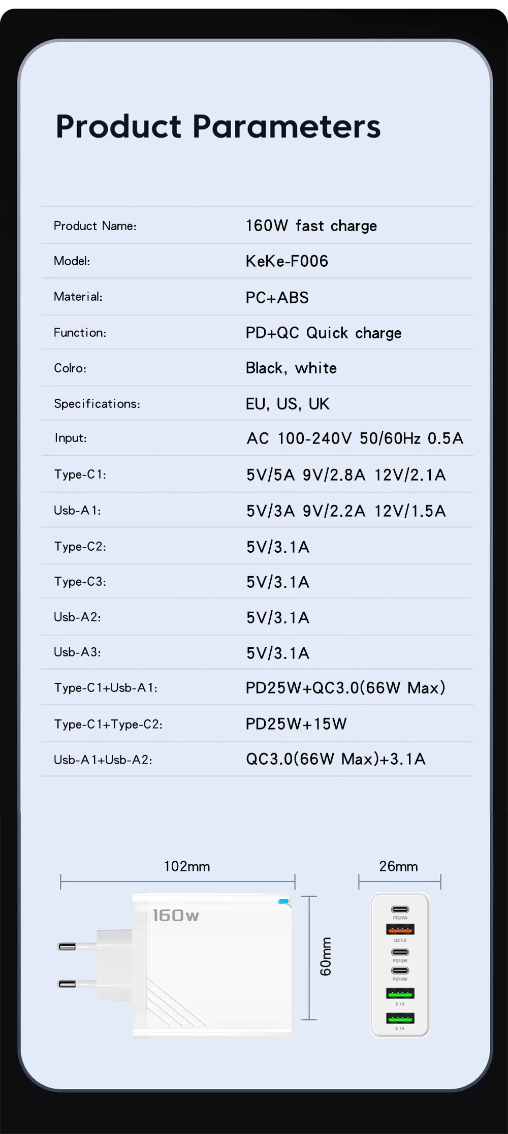 يدعم إجمالي طاقة خرج تصل إلى 160 وات، مزود بـ 6 منافذ شحن (بما في ذلك USB-C وUSB-A)، قادر على شحن أجهزة متعددة في وقت واحد، مما يلبي احتياجات السيناريوهات المختلفة مثل المنزل والمكتب والسفر.