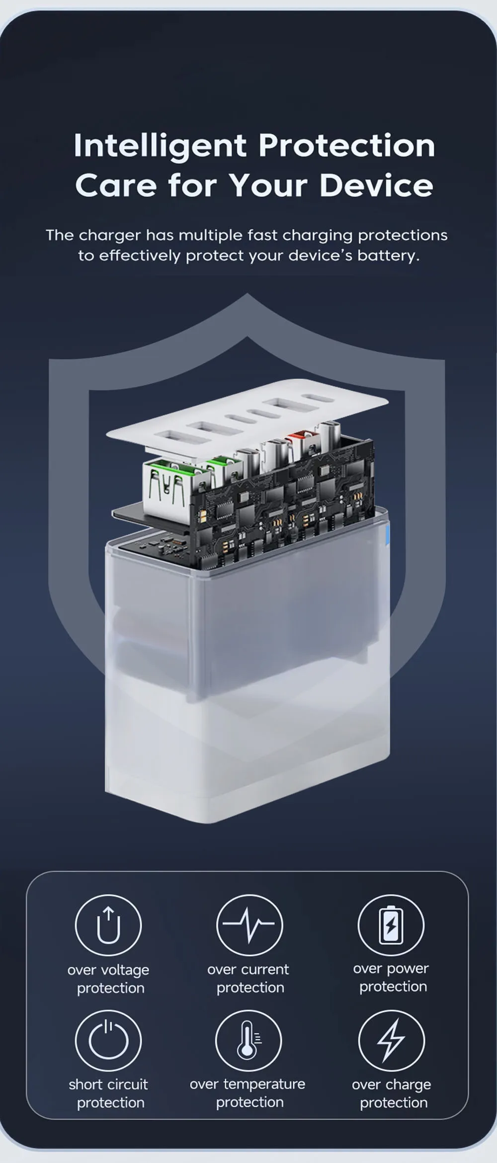 مزود بشريحة ذكية، يمكنه تخصيص الطاقة تلقائيًا وفقًا لمتطلبات الجهاز، وتجنب مشكلات مثل الشحن الزائد، والجهد الزائد، وارتفاع درجة الحرارة، مما يضمن الشحن الآمن.
