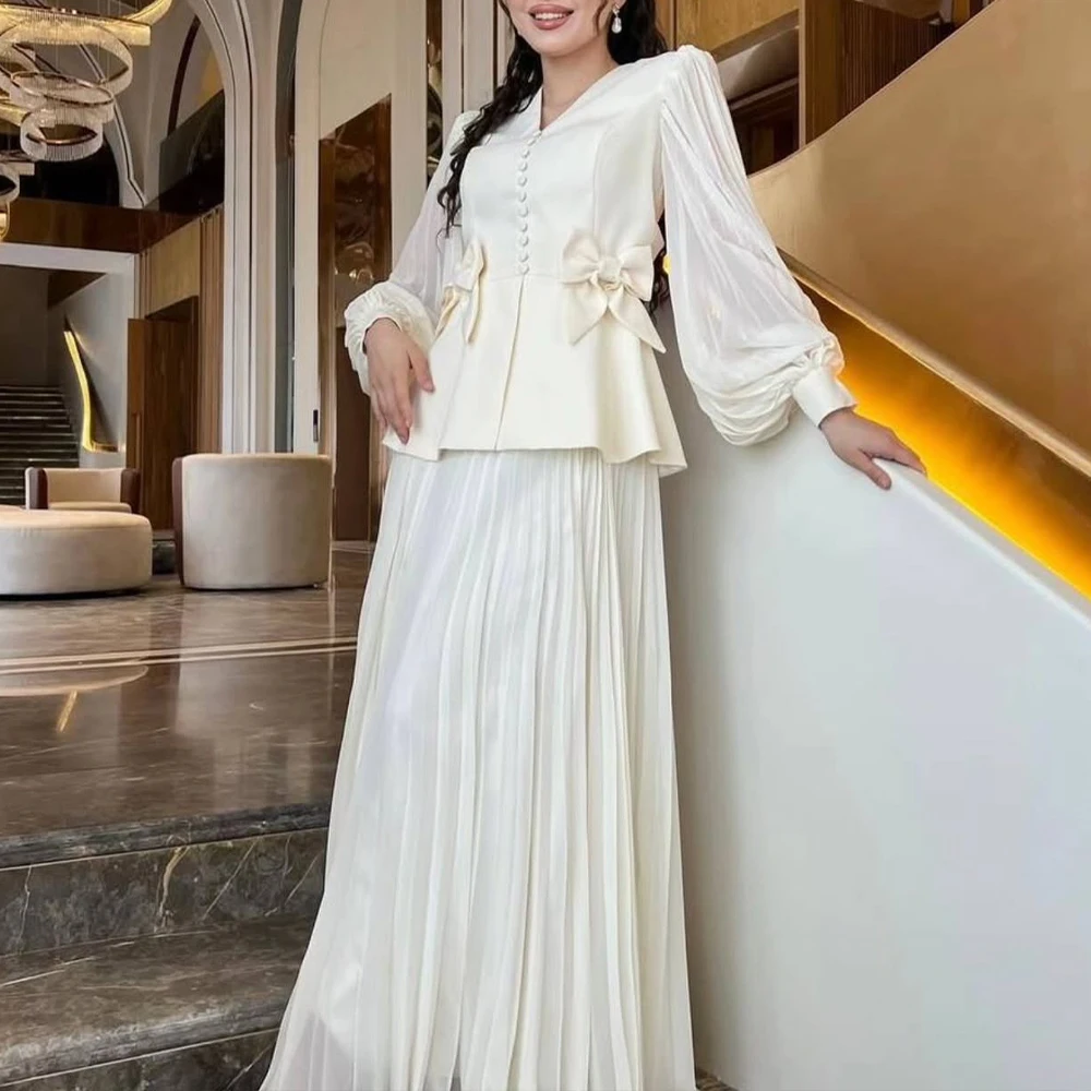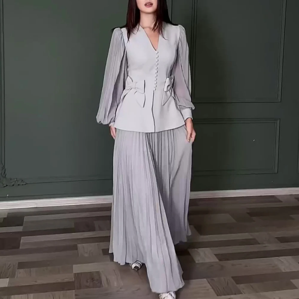 أطقم رافيا الصيفية النسائية 2025 موضة يومية بلون سادة مع فيونكة وأكمام طويلة ورقبة على شكل حرف v تنورة بحاشية مطوية أطقم مكتب للسيدات