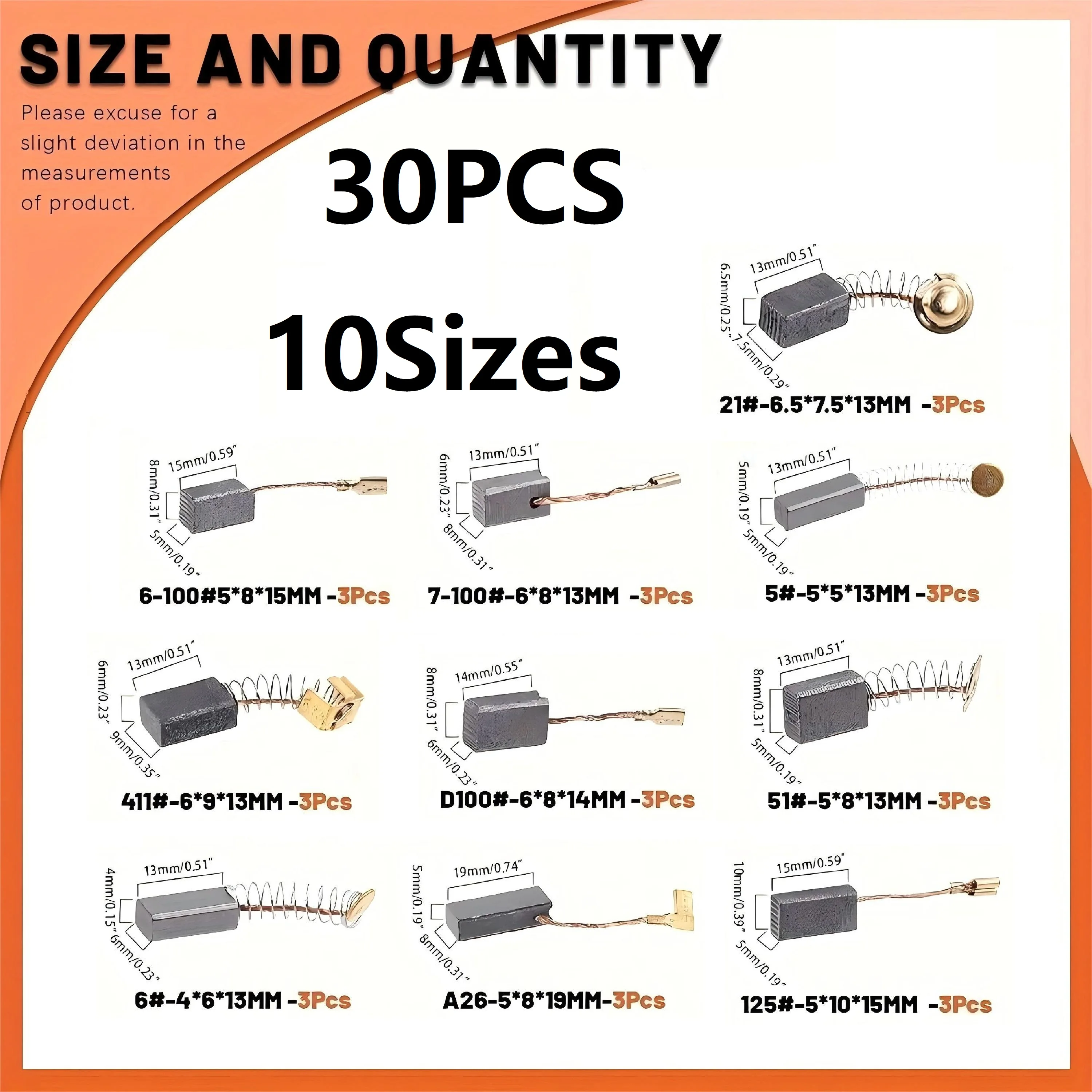 Set of 30 Carbon Brushes, 10 Specifications - Metal, Copper Oxidation, Anti-Slip Grooves, Wear-Resistant - Ideal for Power Tools Repair and Maintenance