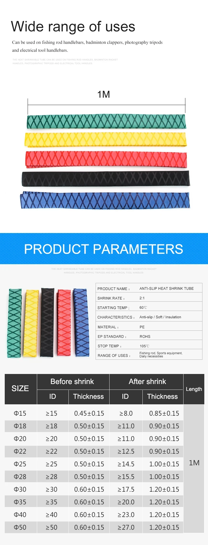 قطعة واحدة من أنابيب الانكماش الحراري المضادة للانزلاق والمتينة لمقبض قضيب الصيد، بطول 1 متر، 5 ألوان، 11 مقاسًا