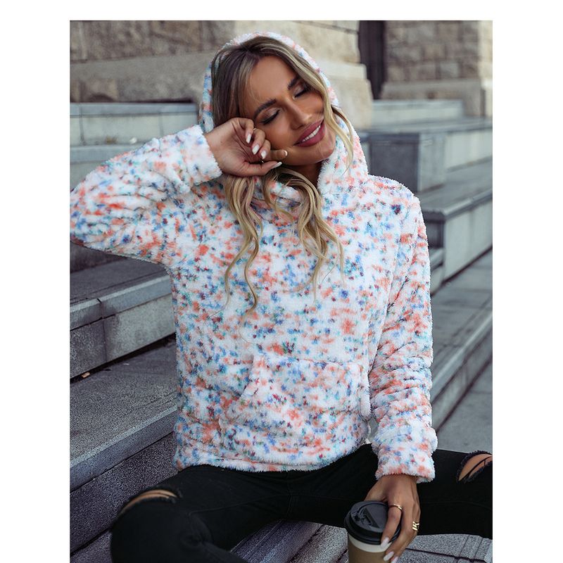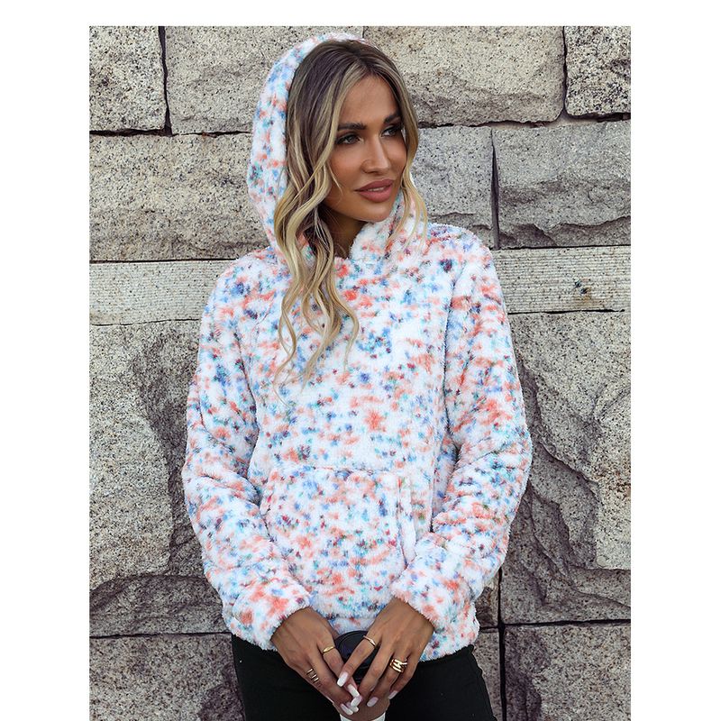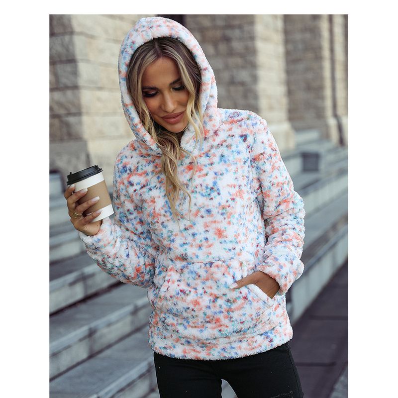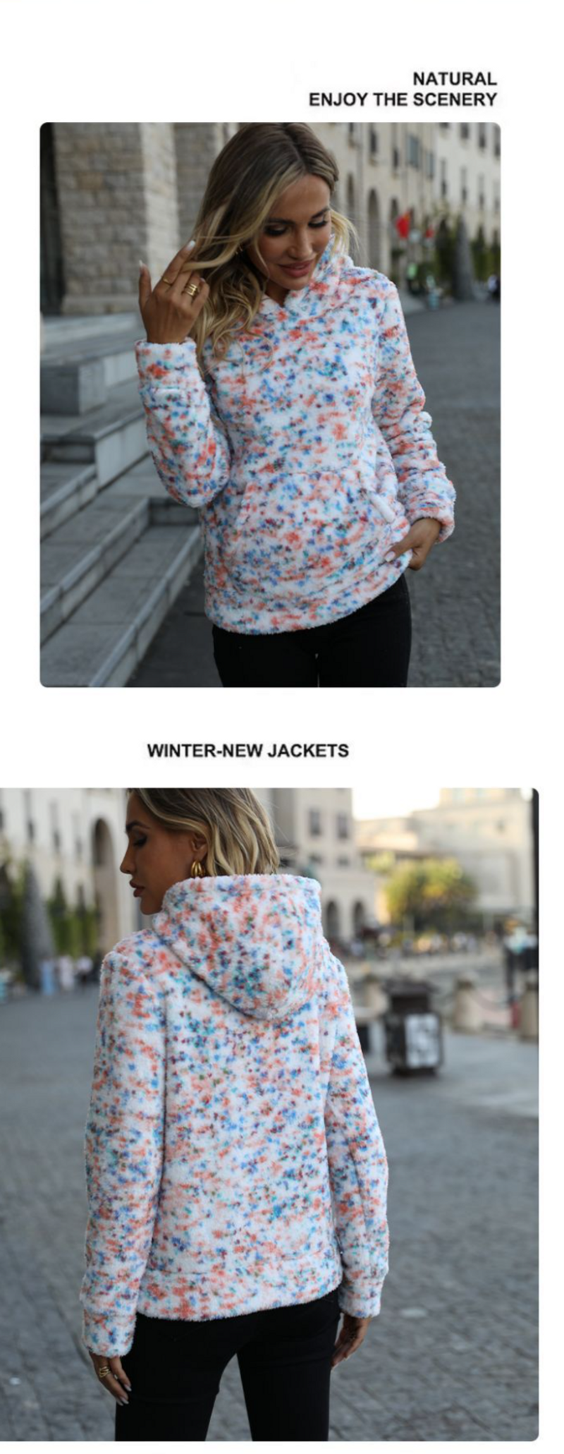 النساء معطف هودي فضفاض طويل الأكمام بنقاط الثلج الكاسحة مطبوعة بشكل عشوائي من الفرو الناعم