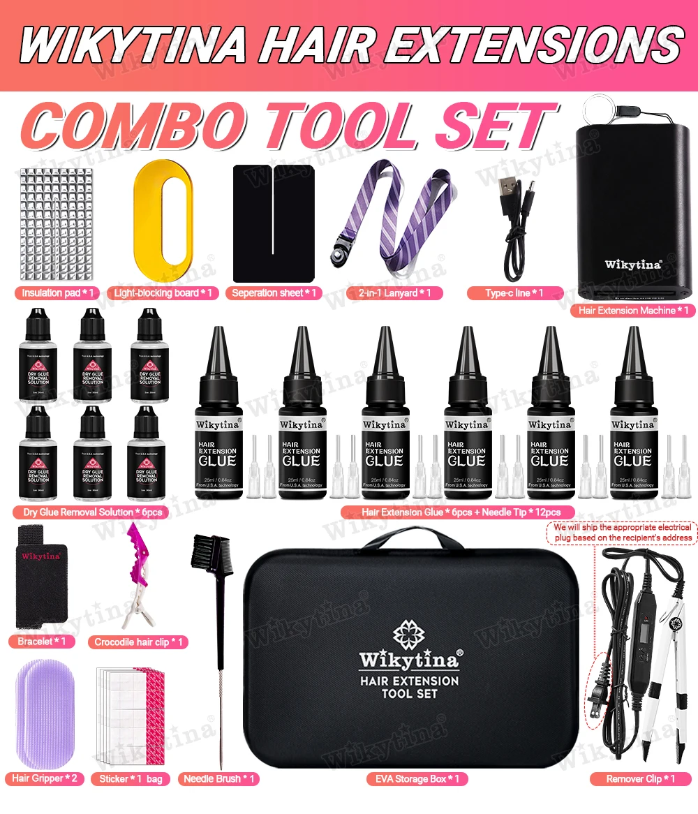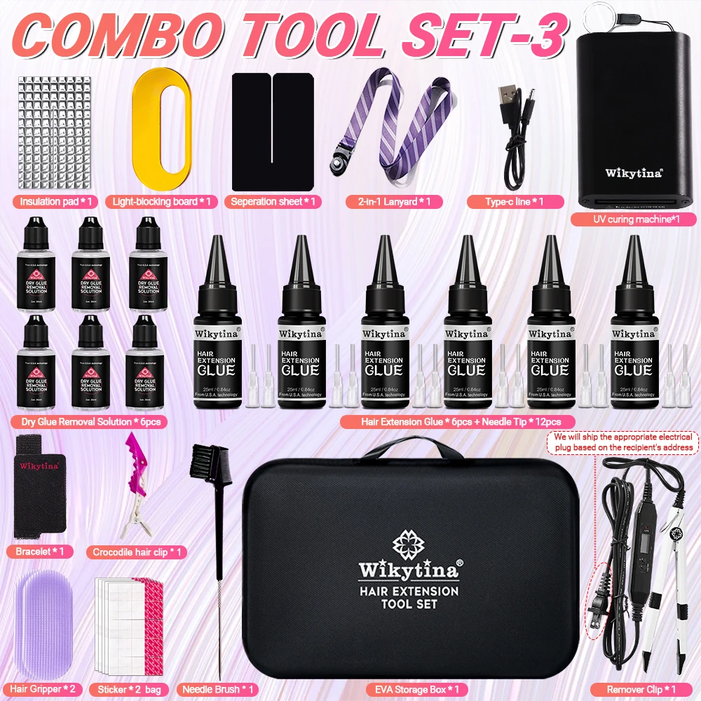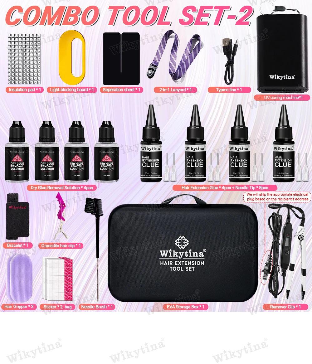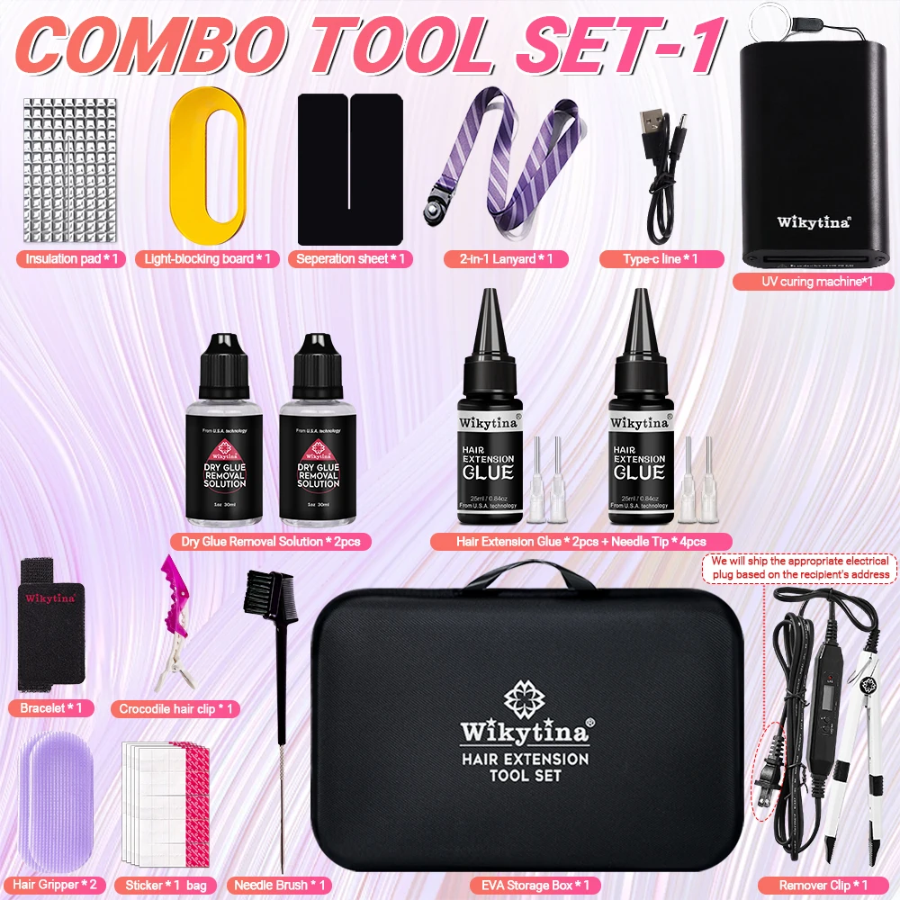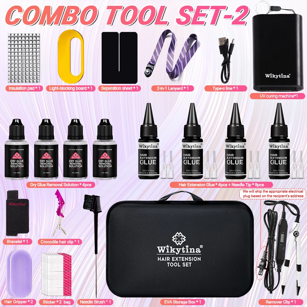 طقم وصلات الشعر الاحترافي بالأشعة فوق البنفسجية من WIKYTINA - مجموعة أدوات كاملة مع آلة إزالة الصمغ بالأشعة فوق البنفسجية، آلة إطالة الشعر بالأشعة فوق البنفسجية