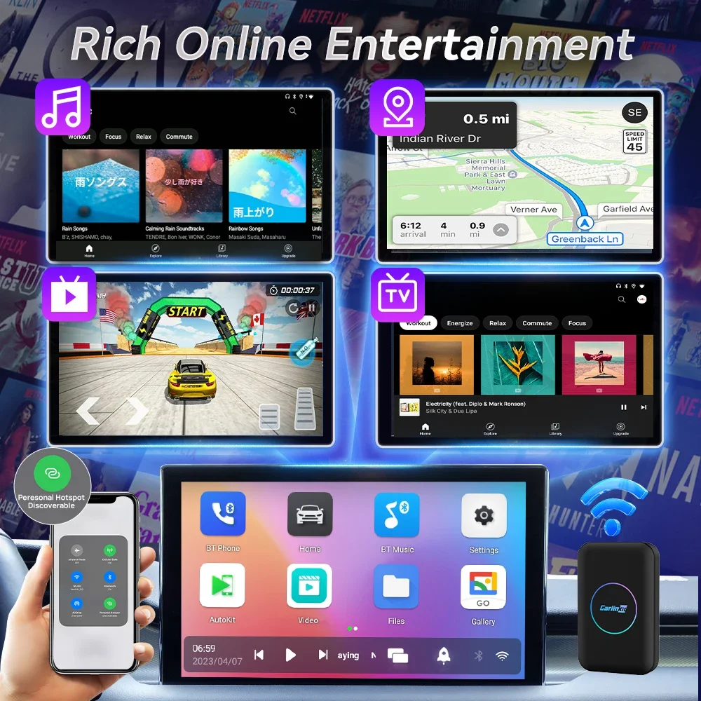 The android tv box also support wireless CarPlay and wireless android auto independently, by which you can connect your iPhone or android phone wirelessly with your car, or just use it as an android device, just give it internet via WiFi hotspot.