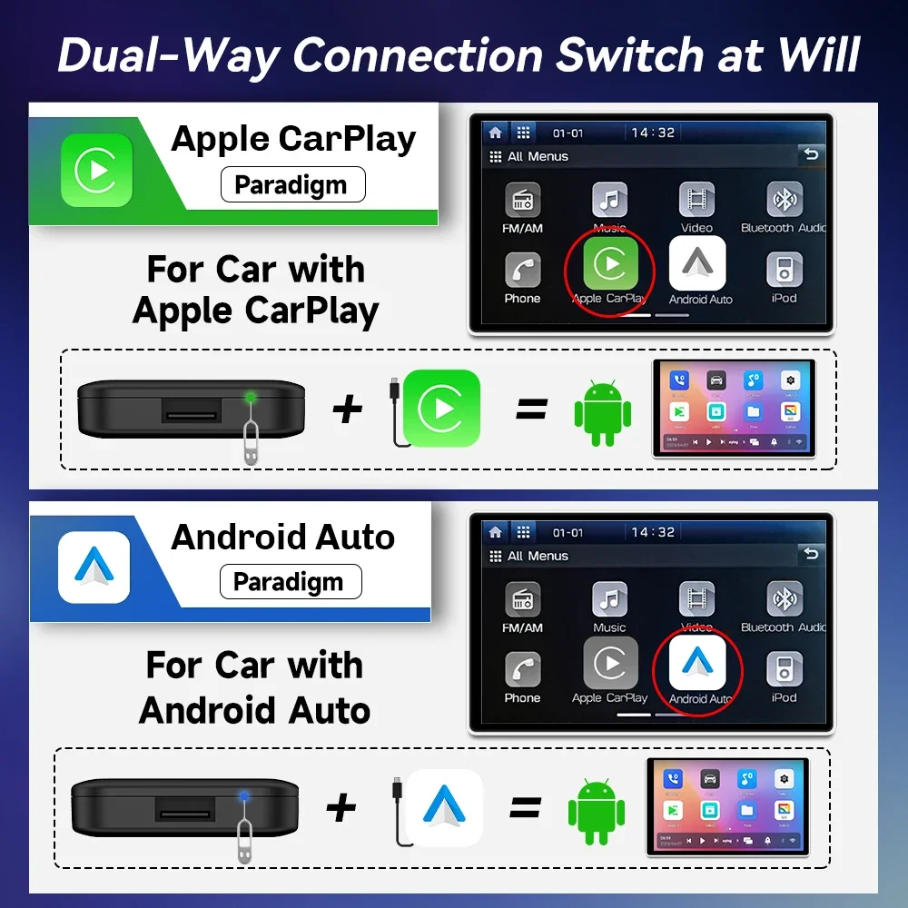 This android device works for both OEM CarPlay car or OEM Android Auto car. It convert your original system to android 10 system. There is a small hole to switch mode between android Auto and CarPlay, check the color of the light,green means CarPlay mode while the blue means Android Auto mode.