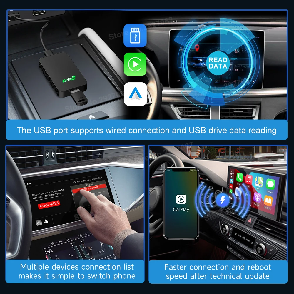 1.The USB port on the wireless adapter not only support wired CarPlay or android auto connection, but also support data reading from USB drive.