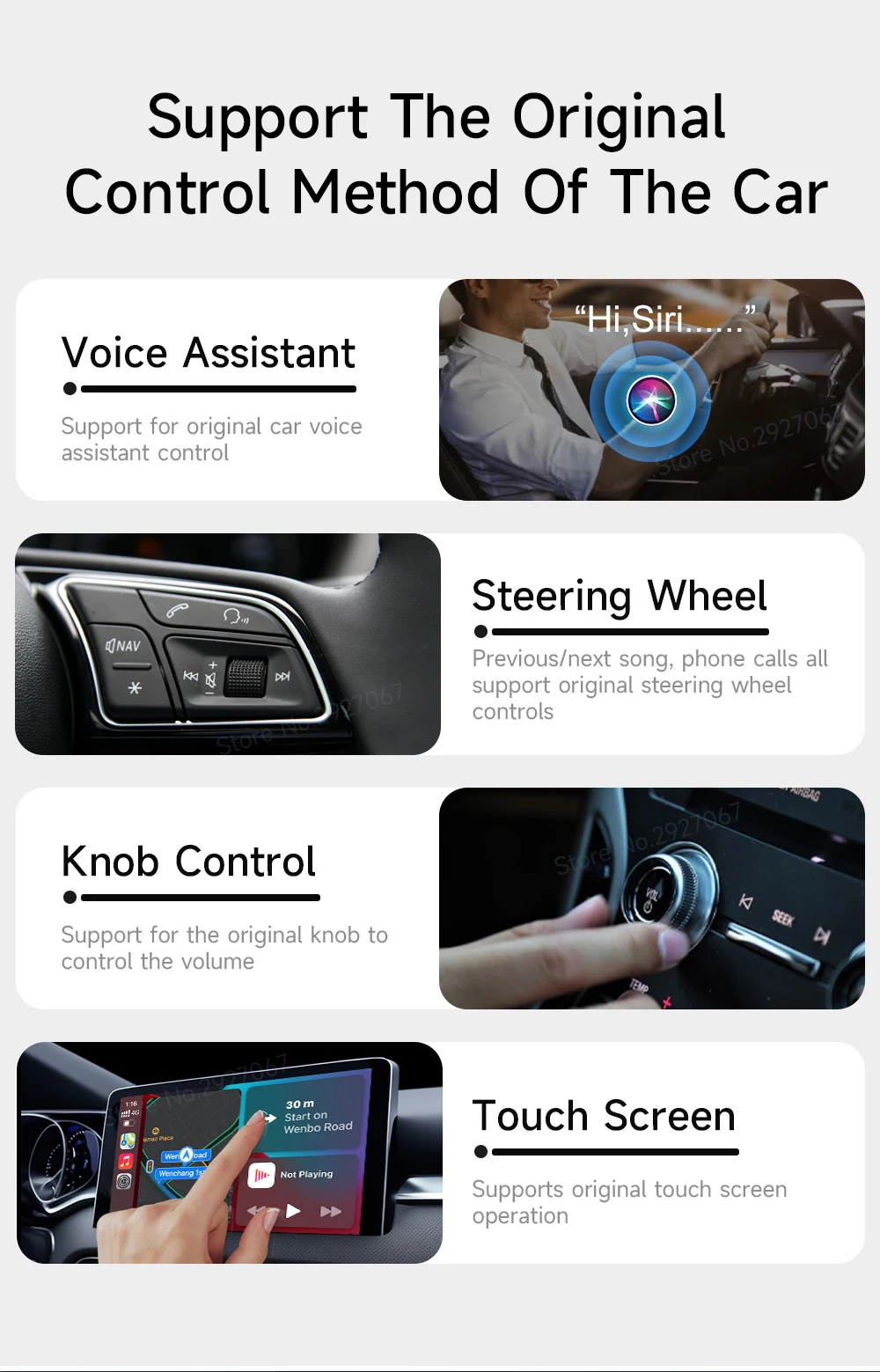 The 2air adapter keeps original features of CarPlay or Android Auto like a wired connection such as original car dashboard and HUD head-up display, compatible with the original car microphone, continue the original car sound quality, steering wheel, button, knob and other operation methods of your original car.