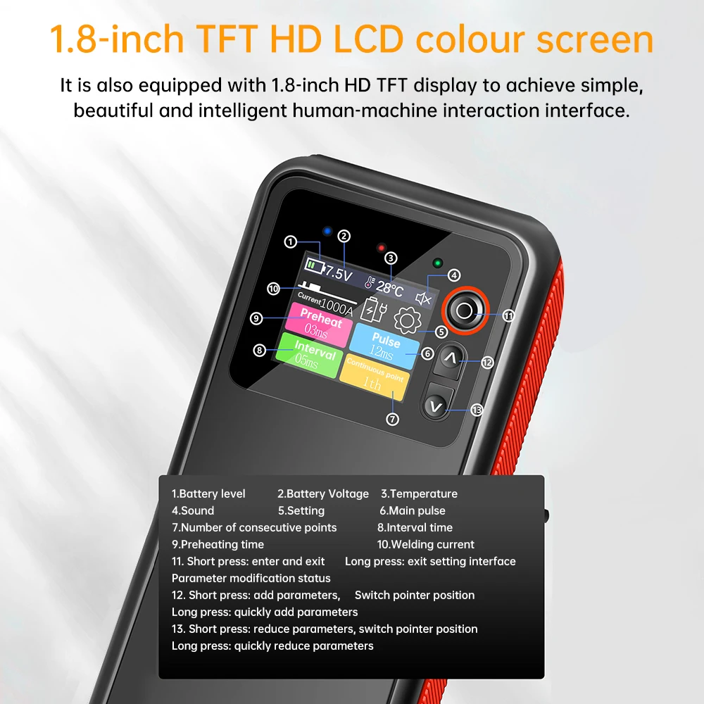 المميزات : 1.شاشة ملونة LCD عالية الوضوح: تعرض الشاشة الملونة TFT LCD مقاس 1.8 بوصة مستوى البطارية والجهد ودرجة الحرارة وتيار اللحام في لم...