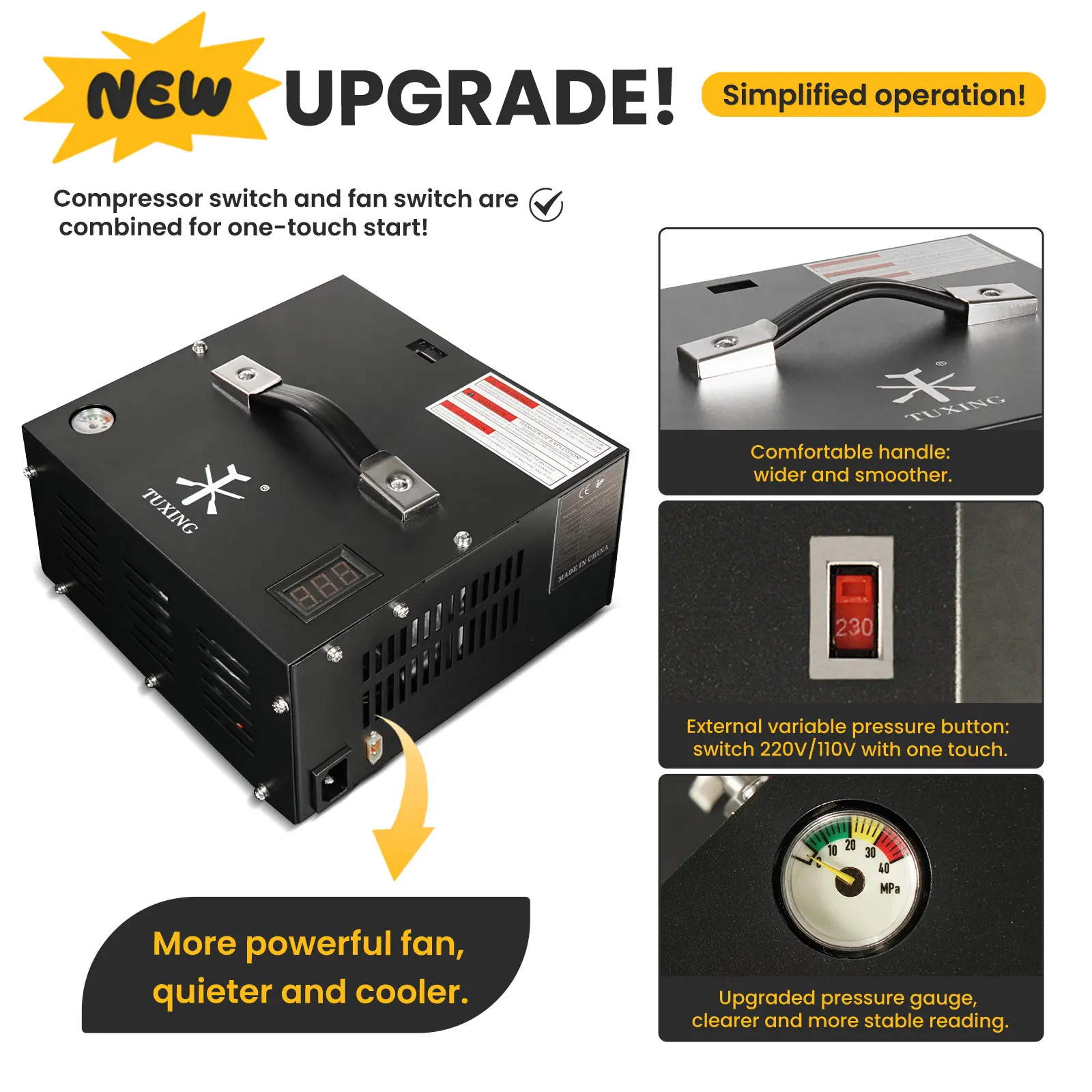 TUXING 300Bar PCP Air Compressor 110V/220V Adjustable Voltage High Pressure Air PUMP with 12VCar Power Supply for PCP Rifle Tank