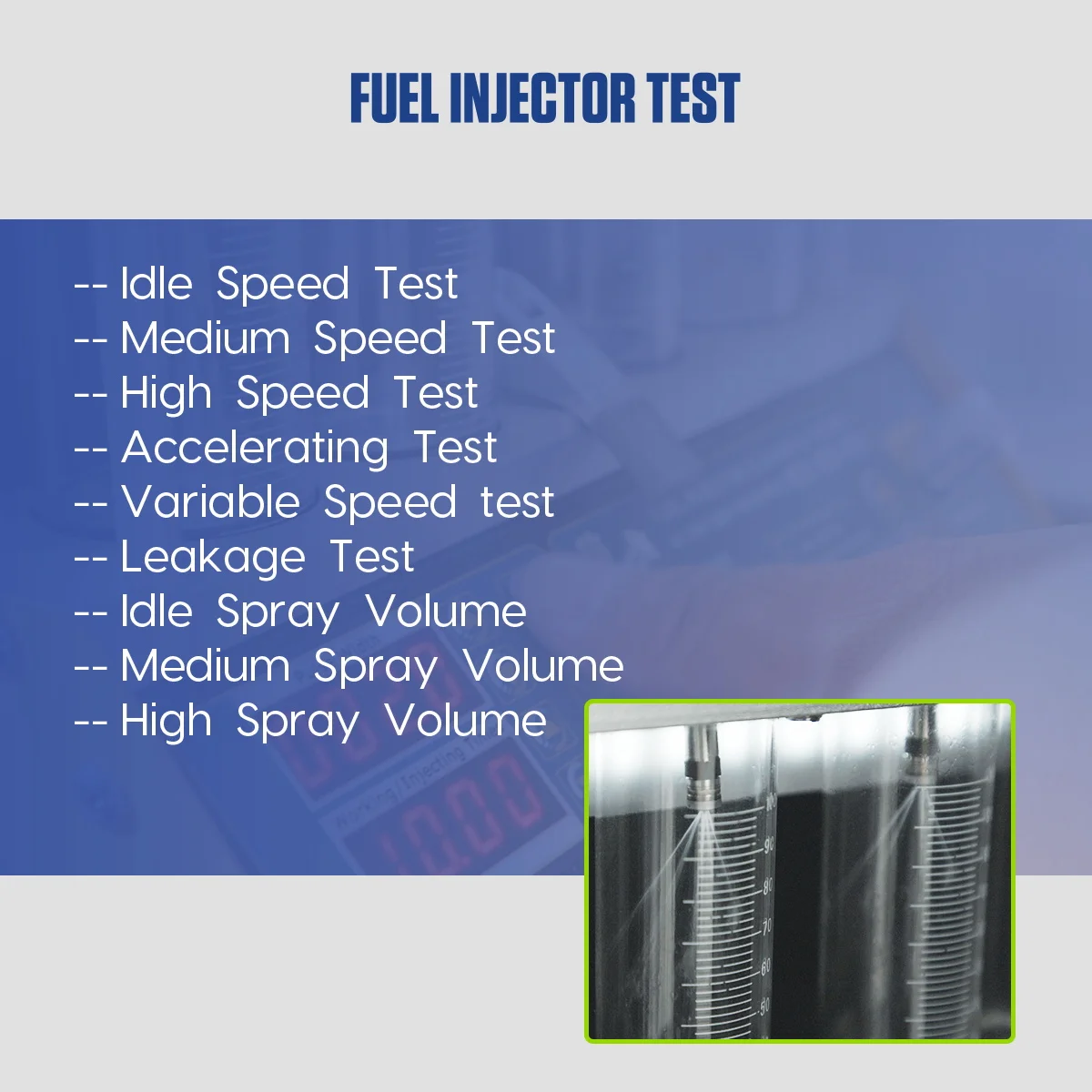 Uniformity Detection, Tightness Test, Fuel Injection Volume Detection, ldle Speed Test, Medium Speed Test, High Speed Test, Variable Speed Test. Cleaning frequency: 40 kHz, ultrasonic cleaning power: 70W, tank capacity: 1300ML.