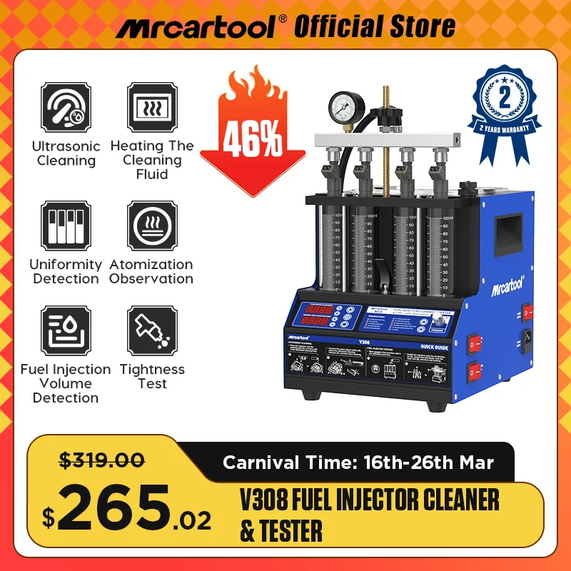 MR CARTOOL V308 Car Fuel Injector Cleaner&Tester 4 Cylinders Cleaning Fluid Heating Ultrasonic Nozzle Cleaning Machine For Motorcycle