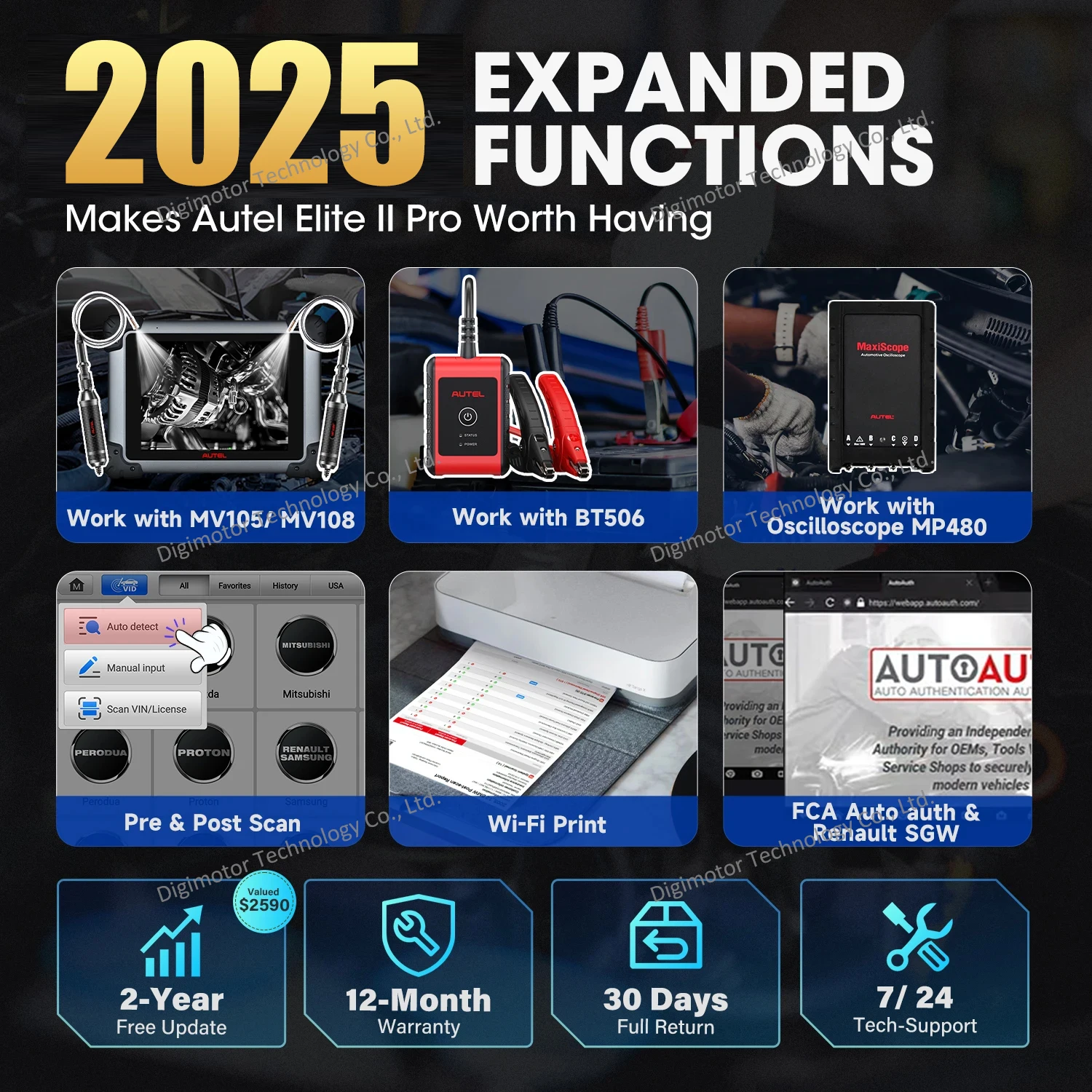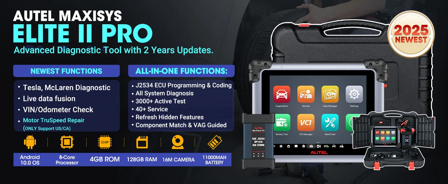 The 2025 recent added functions of Autel scanner Elite 2: ➊Wider Car Coverage with CANFD & DoIP, 150+ Brands Including Tesla, McLaren ➋5X Faster Diagnostics with updated MaxiFlash VCI, Android 10, Auto Scan 2.0 ➌OE-Level All Systems Diagnosis same as Ultra ➍J2534 Programming & Coding ➎40+ Service, All System Diagnosis ➏3000+Active Test ➐Refresh Hidden Features ➑Component Match & VAG Guided ➒2 Years Free Update. Autel Elite 2 is absolutely an ideal solution for car repairs.