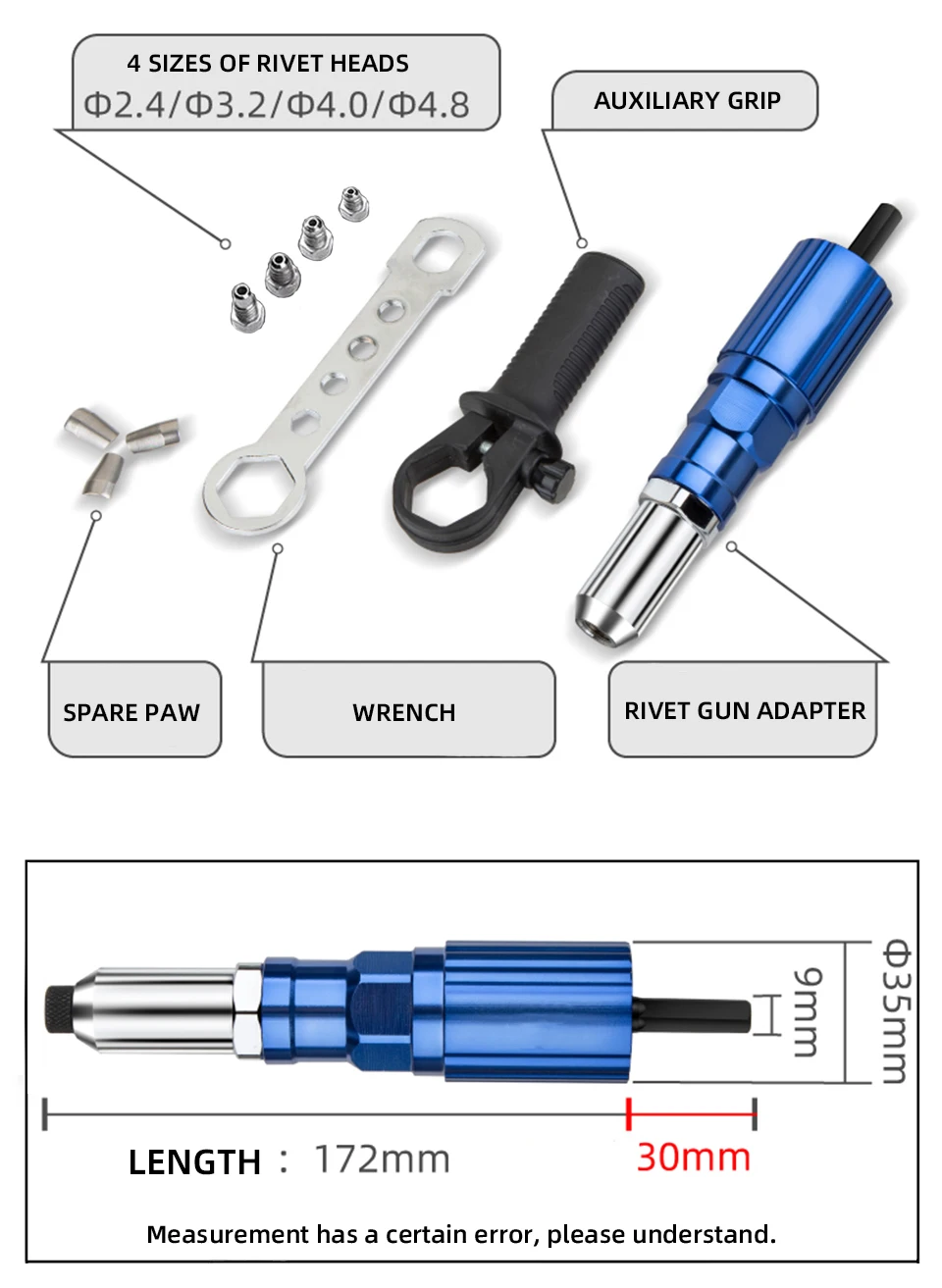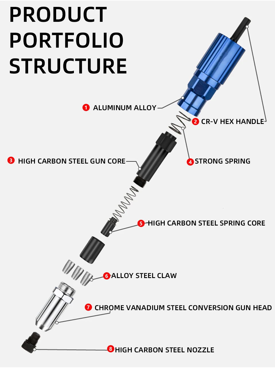 1.عند استخدام محول مسدس البرشام، تحتاج إلى الإمساك بالمقبض الأمامي للعمل بشكل طبيعي.