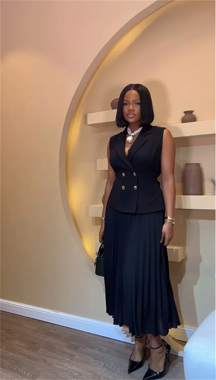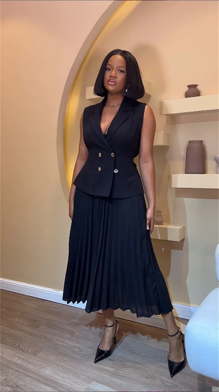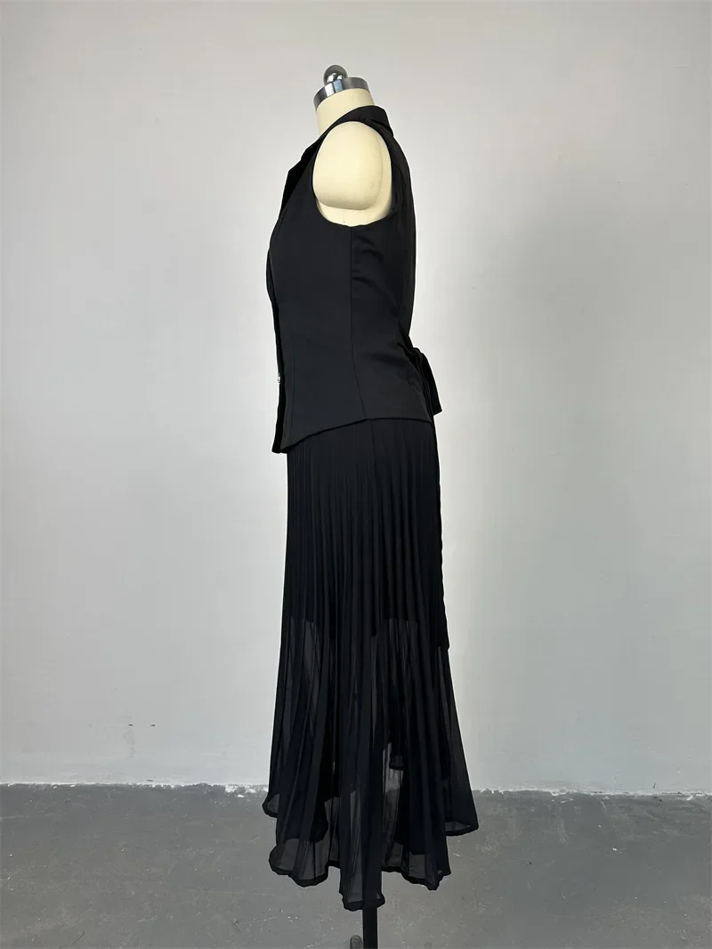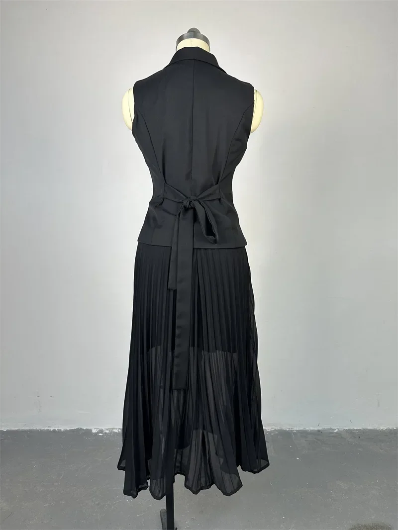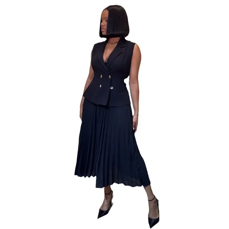 المرأة بلا أكمام زر مزدوج سترة تانك الأعلى الزنانير عالية الخصر مطوي تنورة 2 قطعة مجموعة الملابس