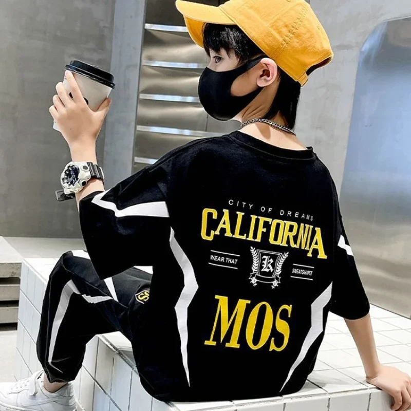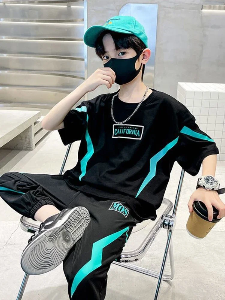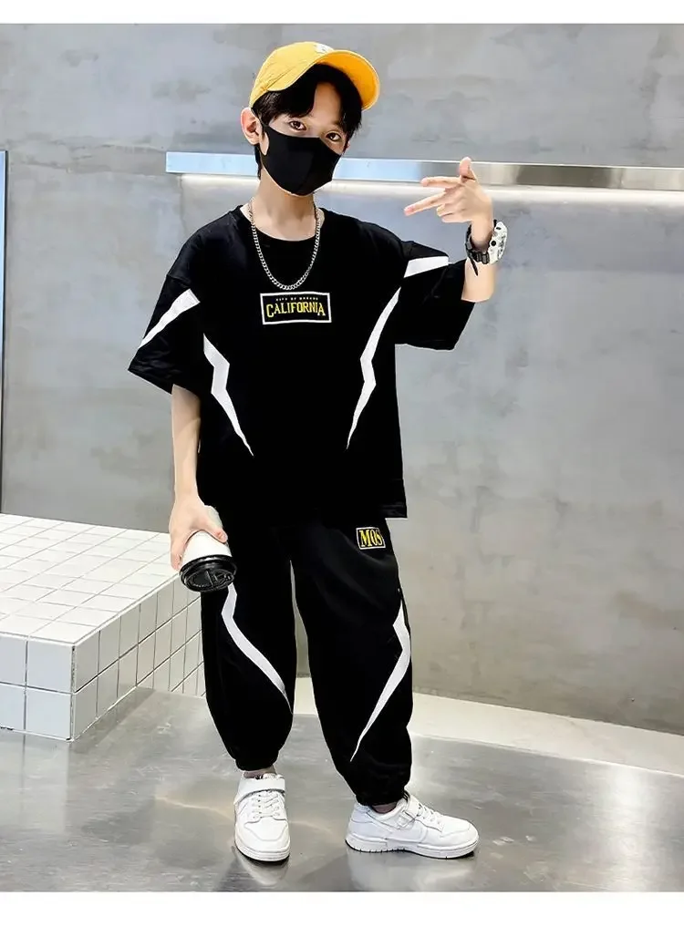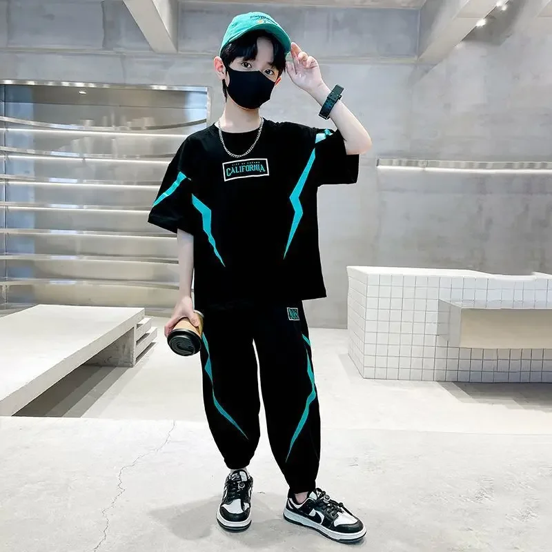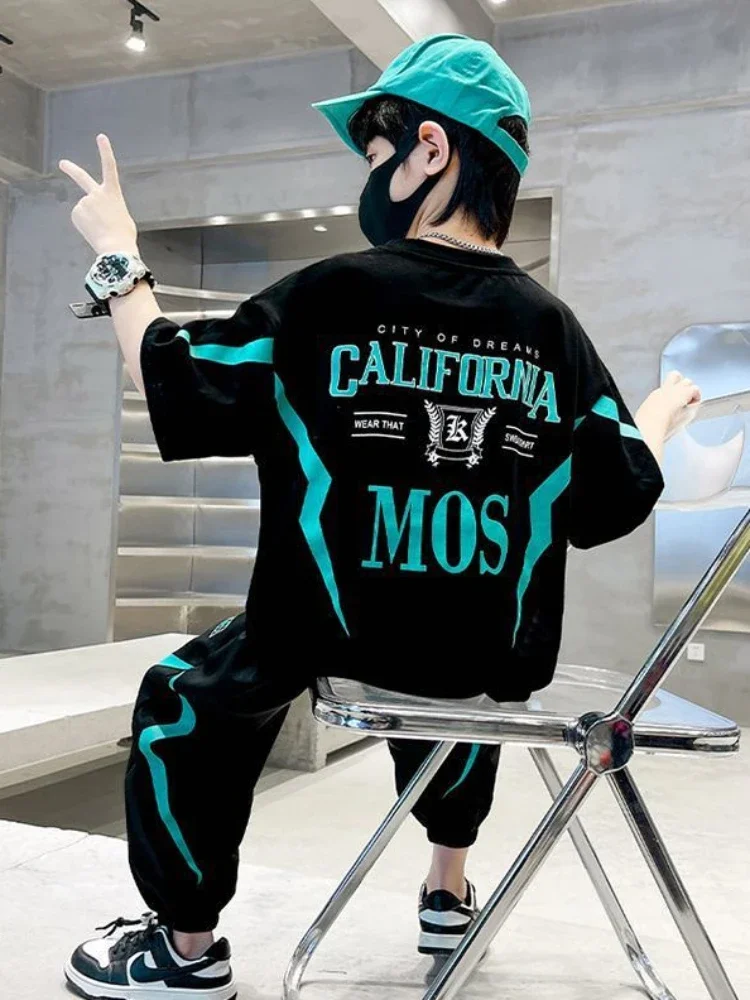 طقم بدلة تي شيرت وبنطال مطبوع عليه حروف للأطفال ، فتاة مراهقة ، أكمام قصيرة ، سطح طاقم ، بدلة رياضية من الأسفل ، ملابس صيفية