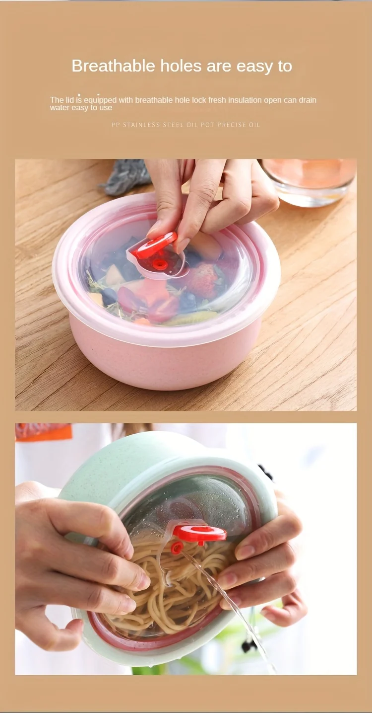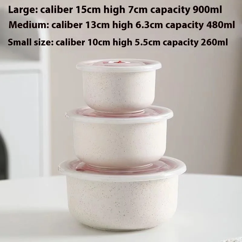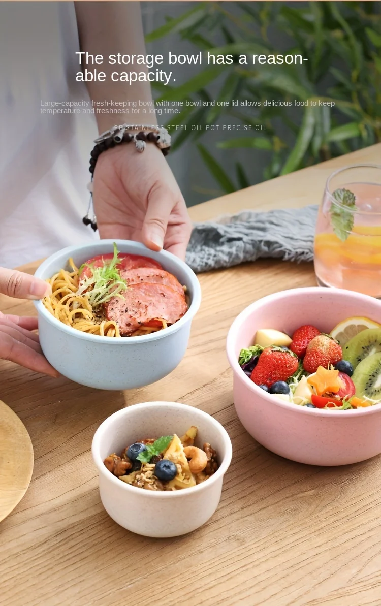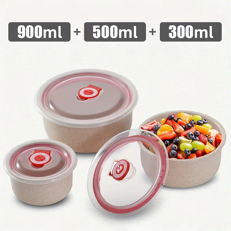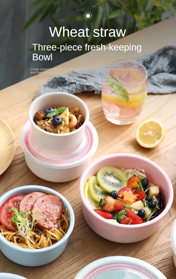 3Set Wheat Straw Freshness Bowl Plastic Microwave Oven Soup Bowl Crisper Practical Bowl round with Lid Lunch Box Salad Bowl