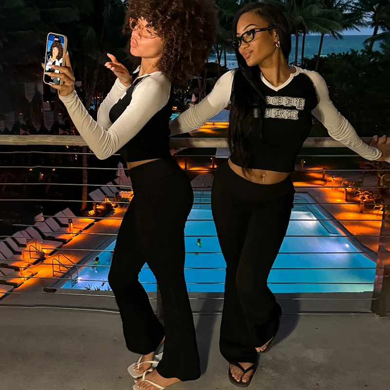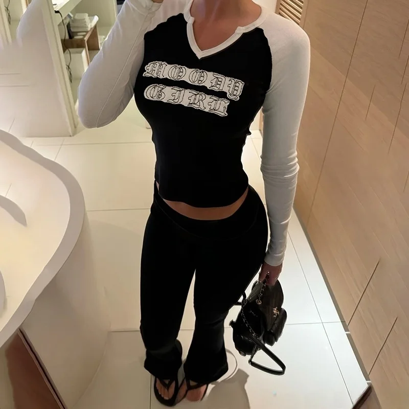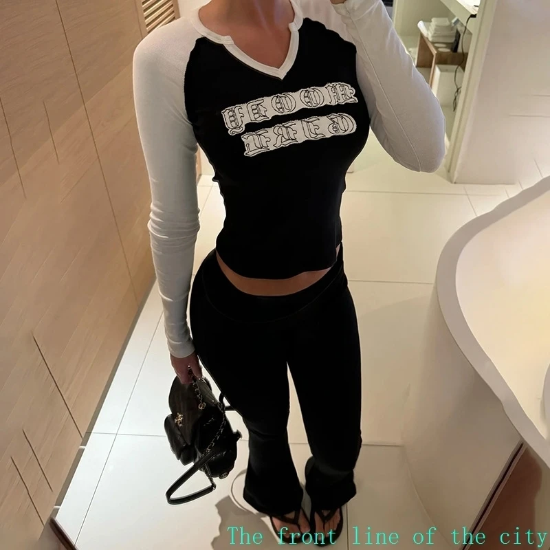 تي شيرت مطبوع عادي مع خطوط وحروف، موضة 2025، ألوان متنوعة، أكمام طويلة، ملابس عادية للنساء، موسم الربيع