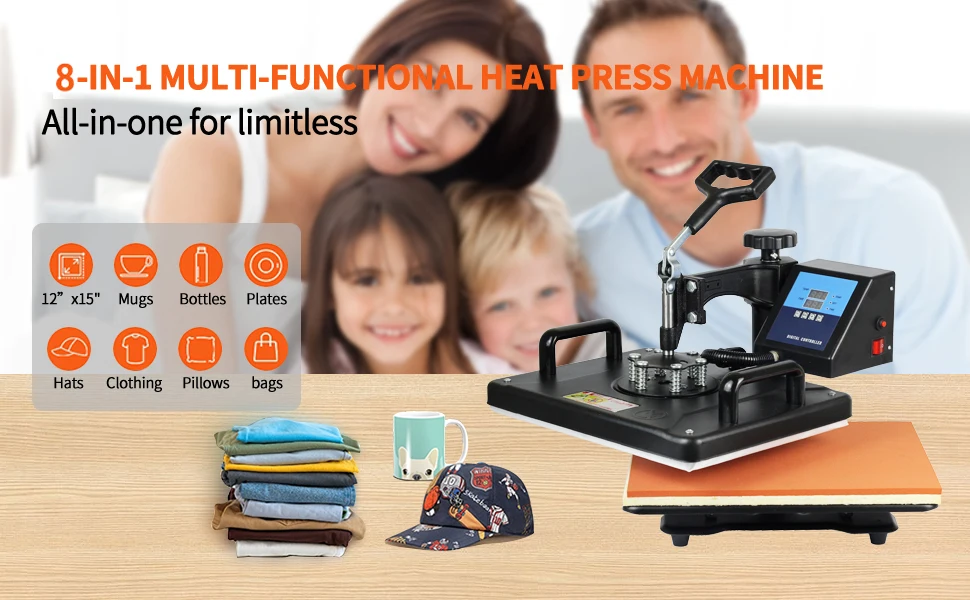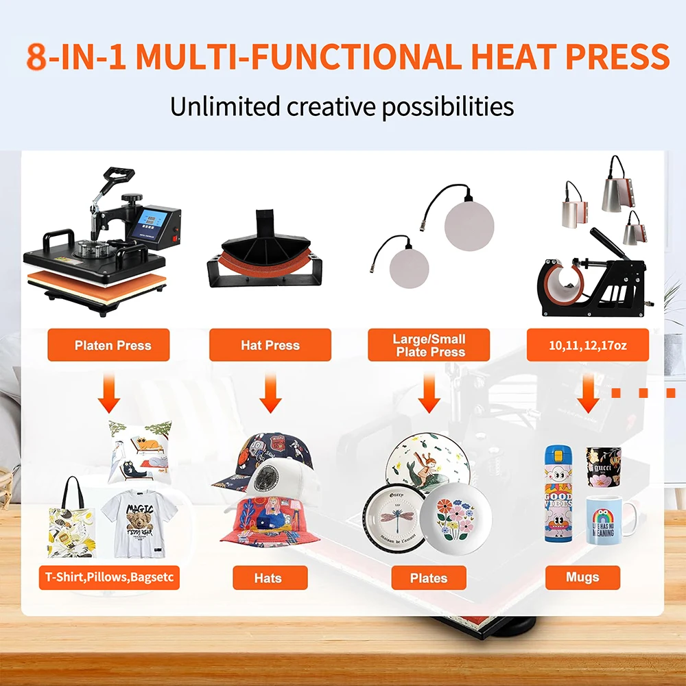 ماكينة ضغط حراري كومبو بتصميم جديد 8 في 1 = وسادة ضغط أكواب 4 (أحجام مختلفة) + مجموعة واحدة وسادة ضغط القبعات + مجموعة واحدة من بطانة القماشية المسطحة + ماكينة ضغط الأطباق 2