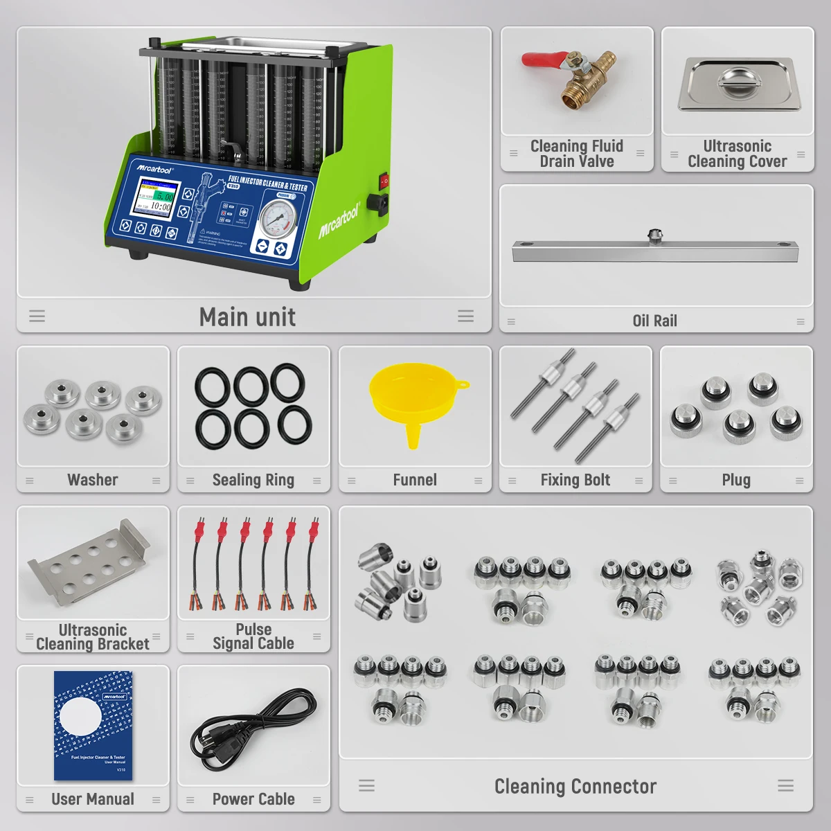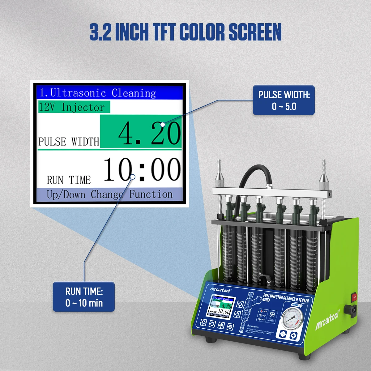يمكن استخدامه لإزالة رواسب الكربون على حاقنات ستة في وقت واحد وتشخيص حاقن الوقود في حالة جيدة أو سيئة، ويتم تطبيقه على نطاق واسع على الحاقنات القياسية، وحاقنات GDI، وحاقن EFI، وحاقن FSI، المتوافقة مع 99% من السيارات والدراجات النارية.