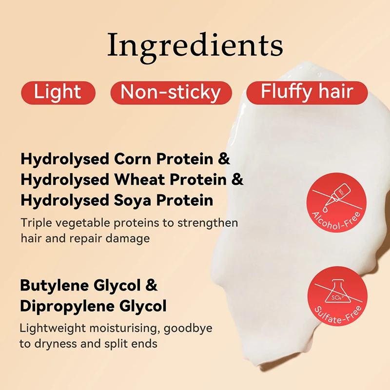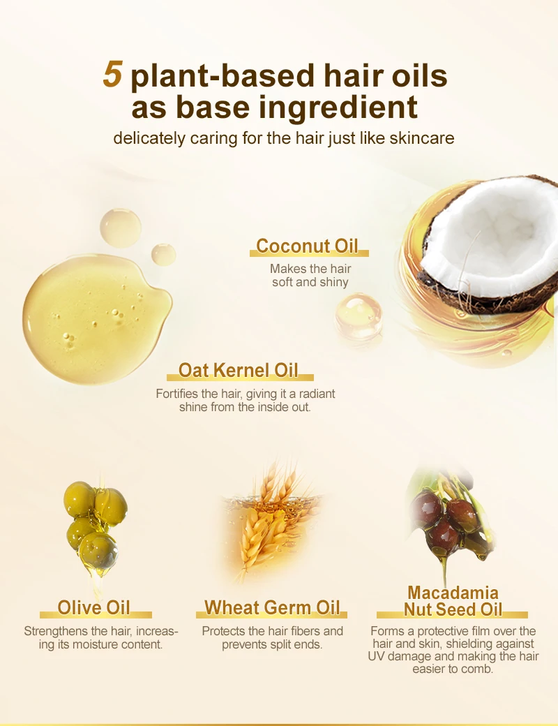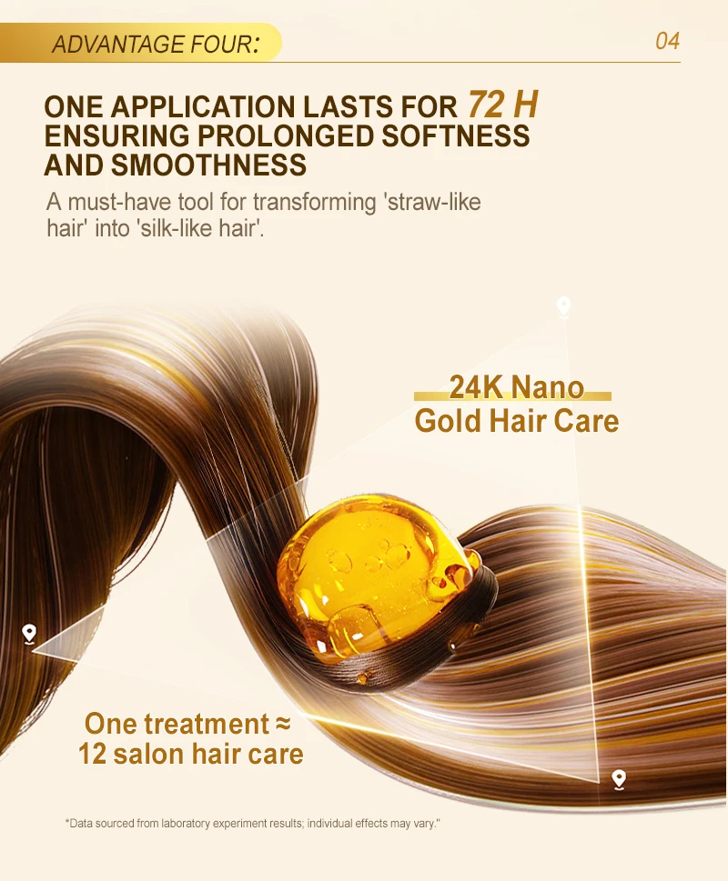 بالإضافة إلى ذلك، فهو مصنوع من مكونات متقدمة مثل الذهب عيار 24 قيراط والأحماض الدهنية الطبيعية المشتقة من النباتات، مما يعزز لمعان الشعر.كما أنه يساعد على حماية الشعر من الأضرار الطفيفة التي تسببها أدوات التصفيف الحراري والتجفيف المتكرر، مما يمنح الشعر مظهرًا صحيًا ولامعًا.
