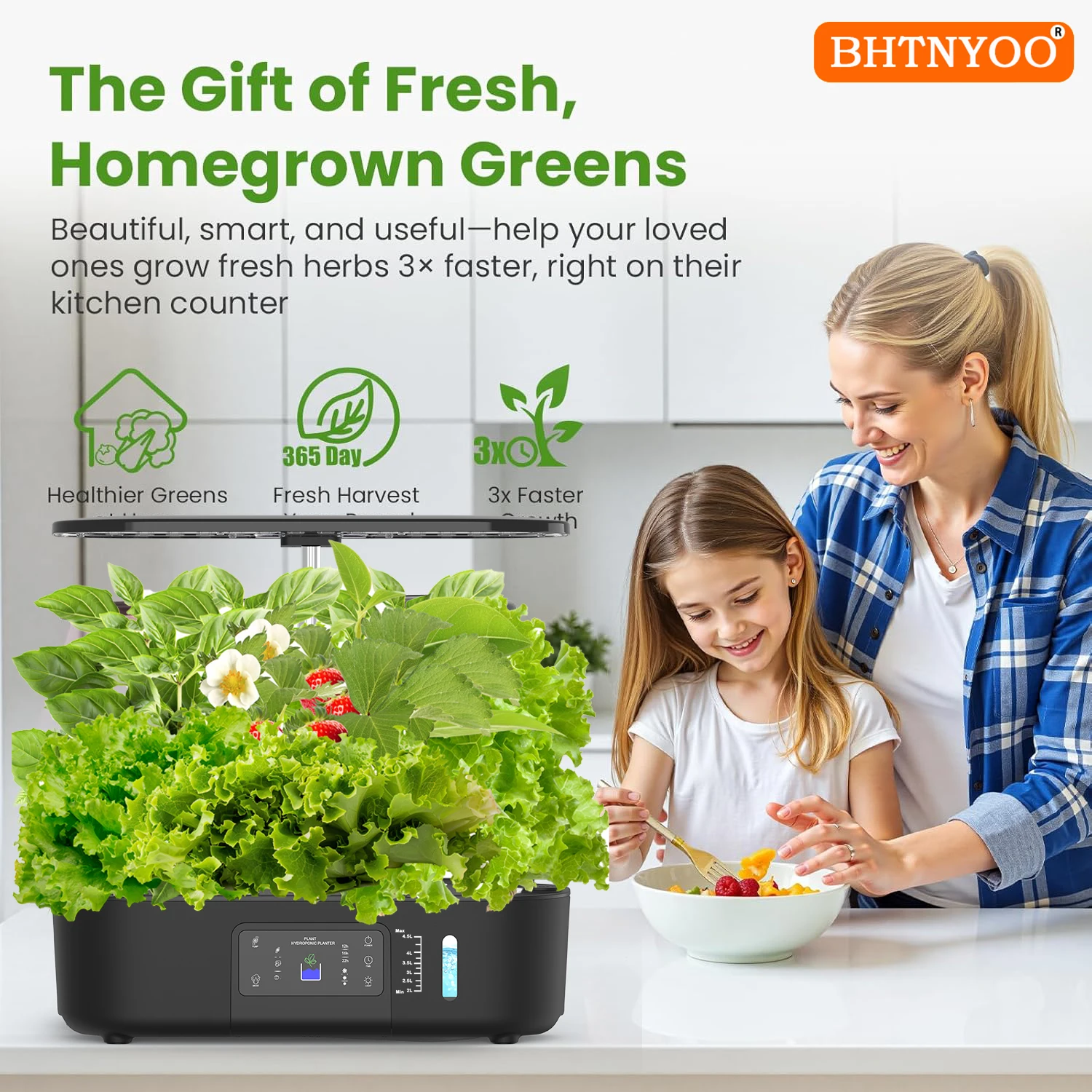 تم تجهيز مجموعة الحدائق الداخلية BHTNYOO بمصابيح LED كاملة الطيف يمكن تعديلها في ثلاثة أوضاع سطوع (وضع الخضار ووضع الفاكهة).يمكن تغيير السطوع والارتفاع حسب حالة نمو الخضروات.بالمقارنة مع التربة، يمكنها زيادة معدل نمو النبات بمقدار 5 مرات، مما يجعلها مناسبة جدًا للشتاء أو ظروف الإضاءة المنخفضة.باستخدام أجهزة ضبط الوقت القابلة للبرمجة، ما عليك سوى ضبطها مرة واحدة لتجعل نباتاتك تنمو بسهولة.