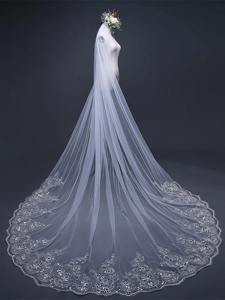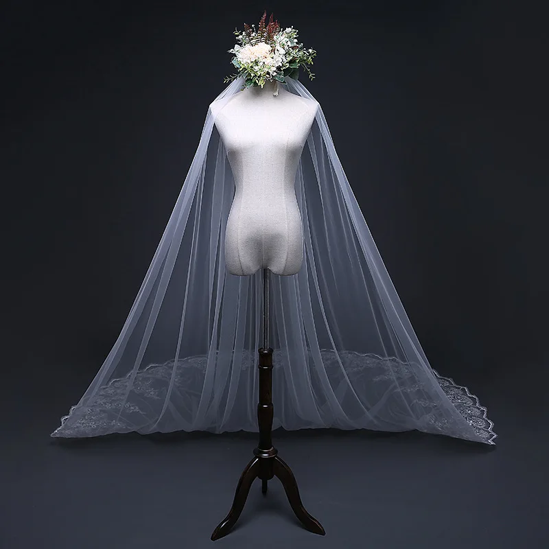 Hot Sale 3*3 Meter Cathedral Wedding Veils White Ivory Black One Layer Lace Appliqued Bride Veils Velo De Novia