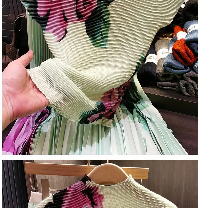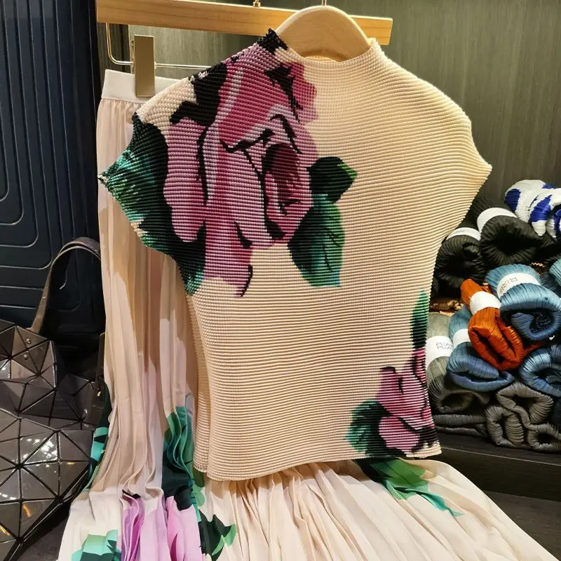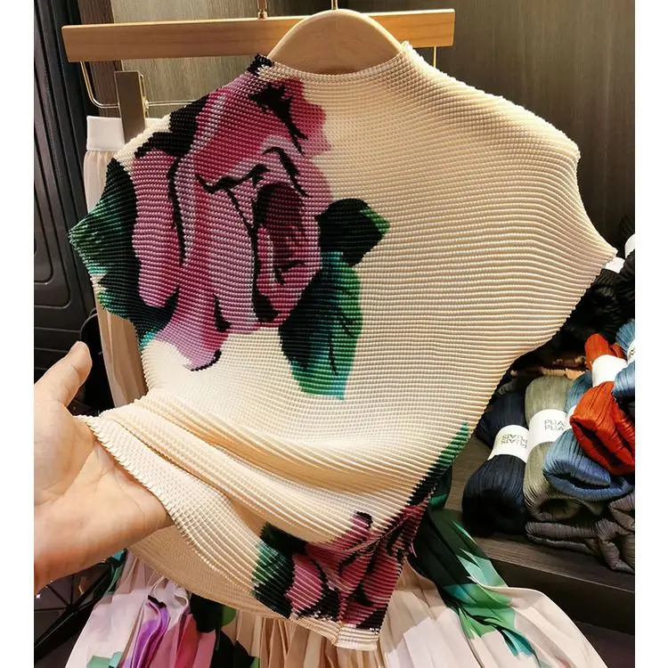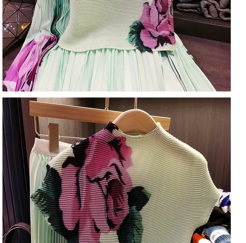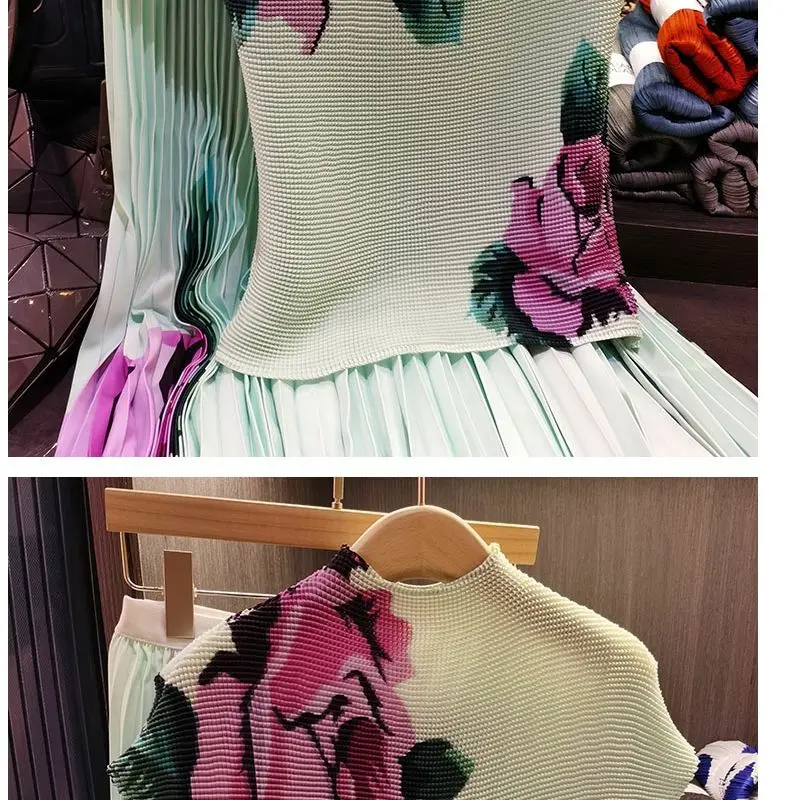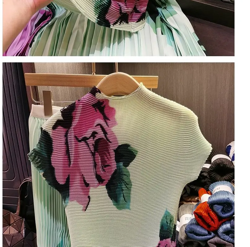 تي شيرت نسائي مطبوع بنصف ياقة عالية وتنورة قصيرة ، تيشيرتات كورية ، أطقم من قطعتين ، ملابس خروج للربيع