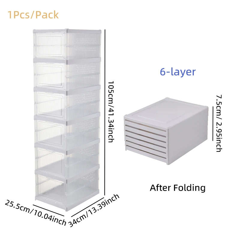 3.قابلة للطي: يوفر صندوق الأحذية الخاص بنا سهولة الطي، مما يسمح لك بتعديله إلى 1-6 طبقات حسب الرغبة.تضمن هذه الميزة أنها لا تشغل مساحة زائدة عند عدم الاستخدام.