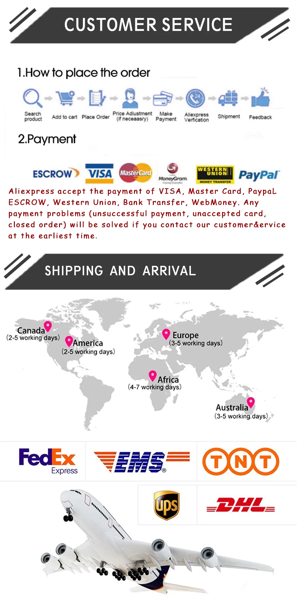 وقت التسليم | (1). الشحن السريع (2) الشحن الطبيعي يستغرق 15-45 يوم عمل عن طريق Aliexpress الشحن القياسية. (3) 4-5 أيام عمل بواسطة DHL ، Fedex ، UPS express. |