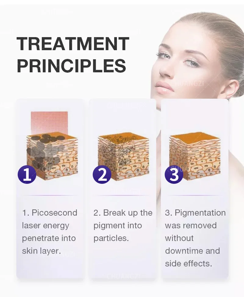يستخدم ليزر بيكوثانية نبضات قصيرة للغاية (طول واحد من تريليون من الثانية) لضرب الميلانين بضغط كبير ، ويتحطم الميلانين إلى جزيئات صغيرة تشبه الغبار ، لأن الجسيمات صغيرة جدا ، يتم امتصاصها بسهولة أكبر والقضاء عليها من قبل الجسم. سوف يقلل بشكل كبير من تورم ما بعد الجراحة ، ظاهرة ترسيب الميلانين.