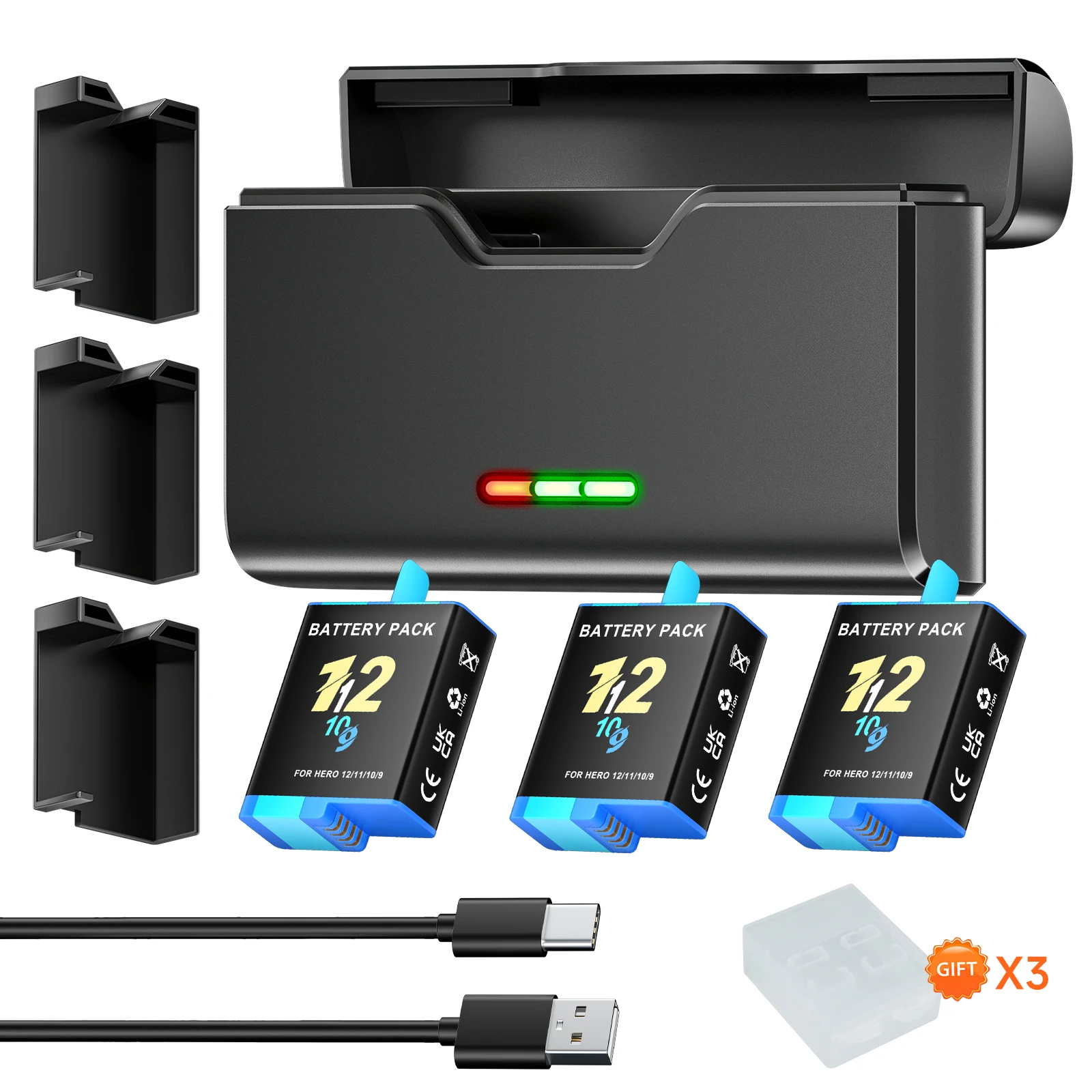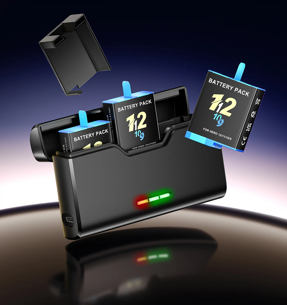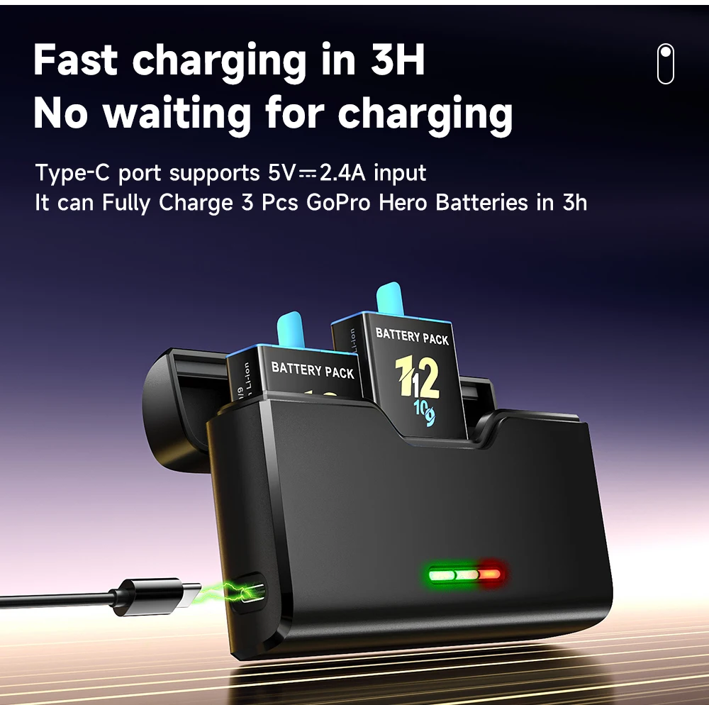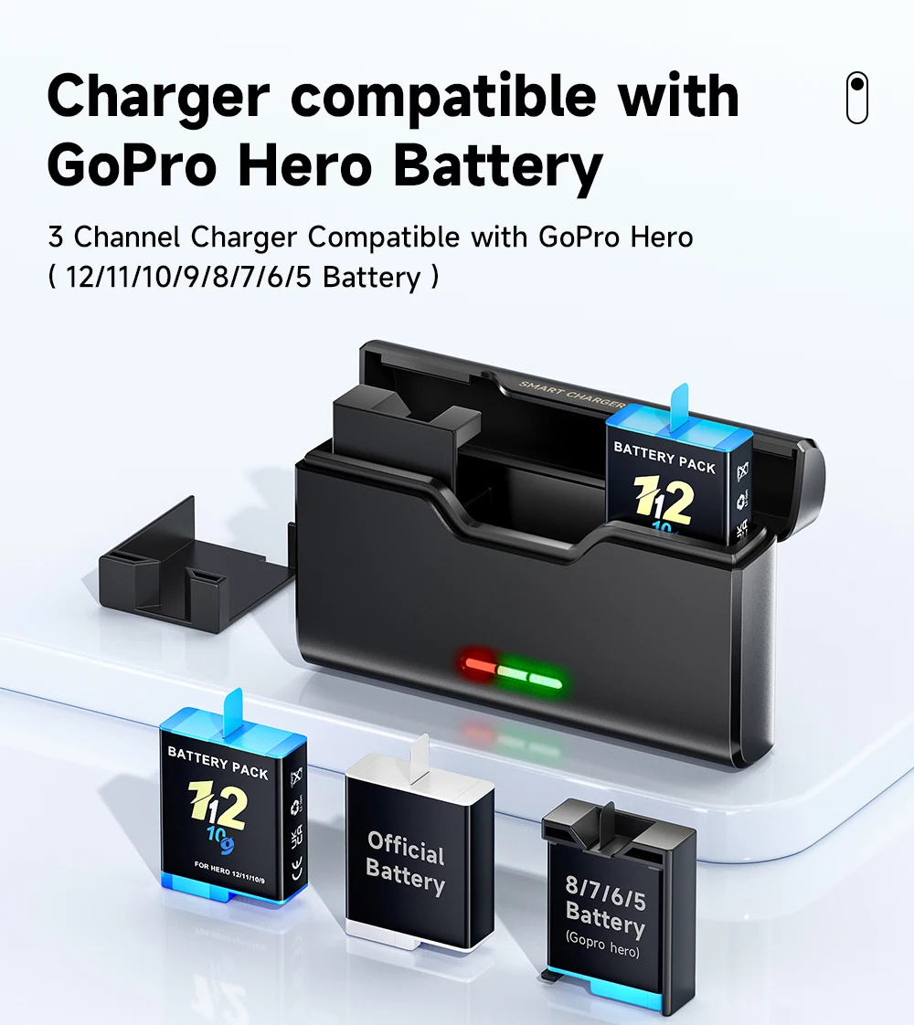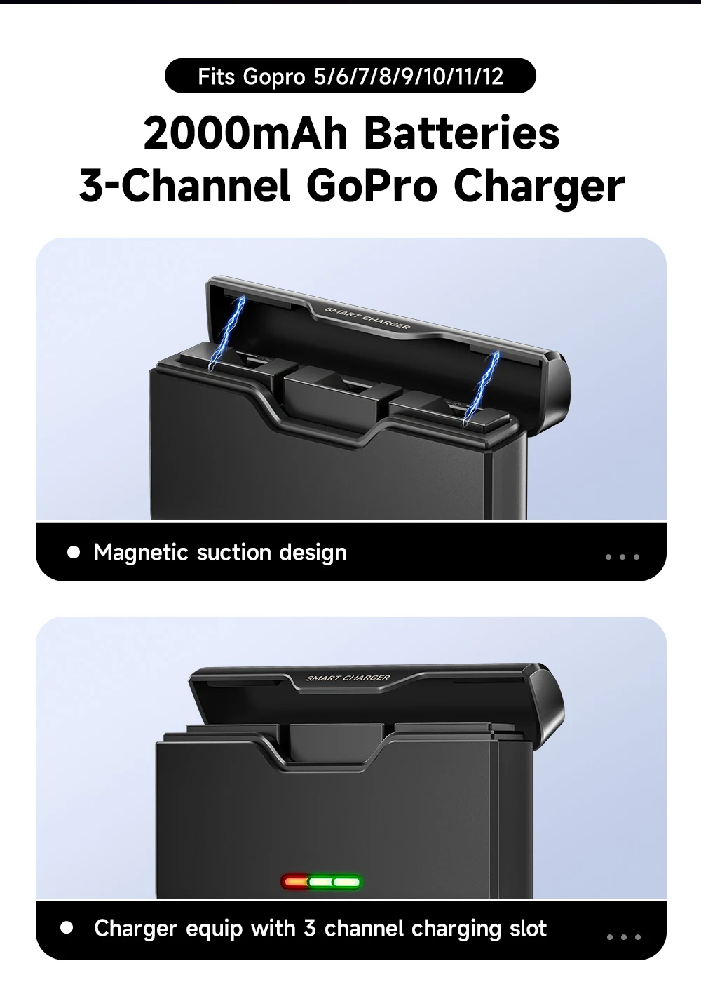 1. يناسب gopro Hero 12/11/10/9/8/7/6/5، ويمكن شحن 3 بطاريات في المرة الواحدة.