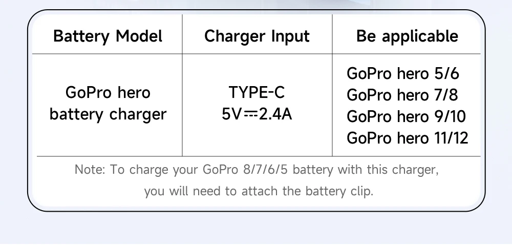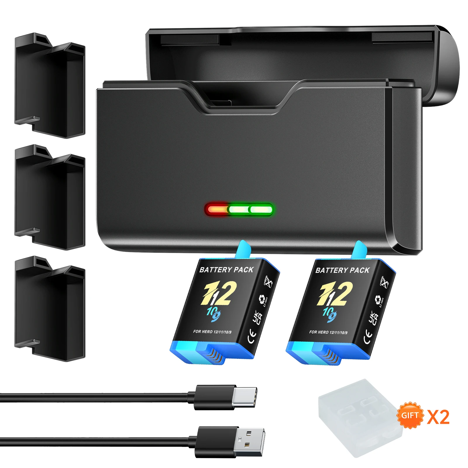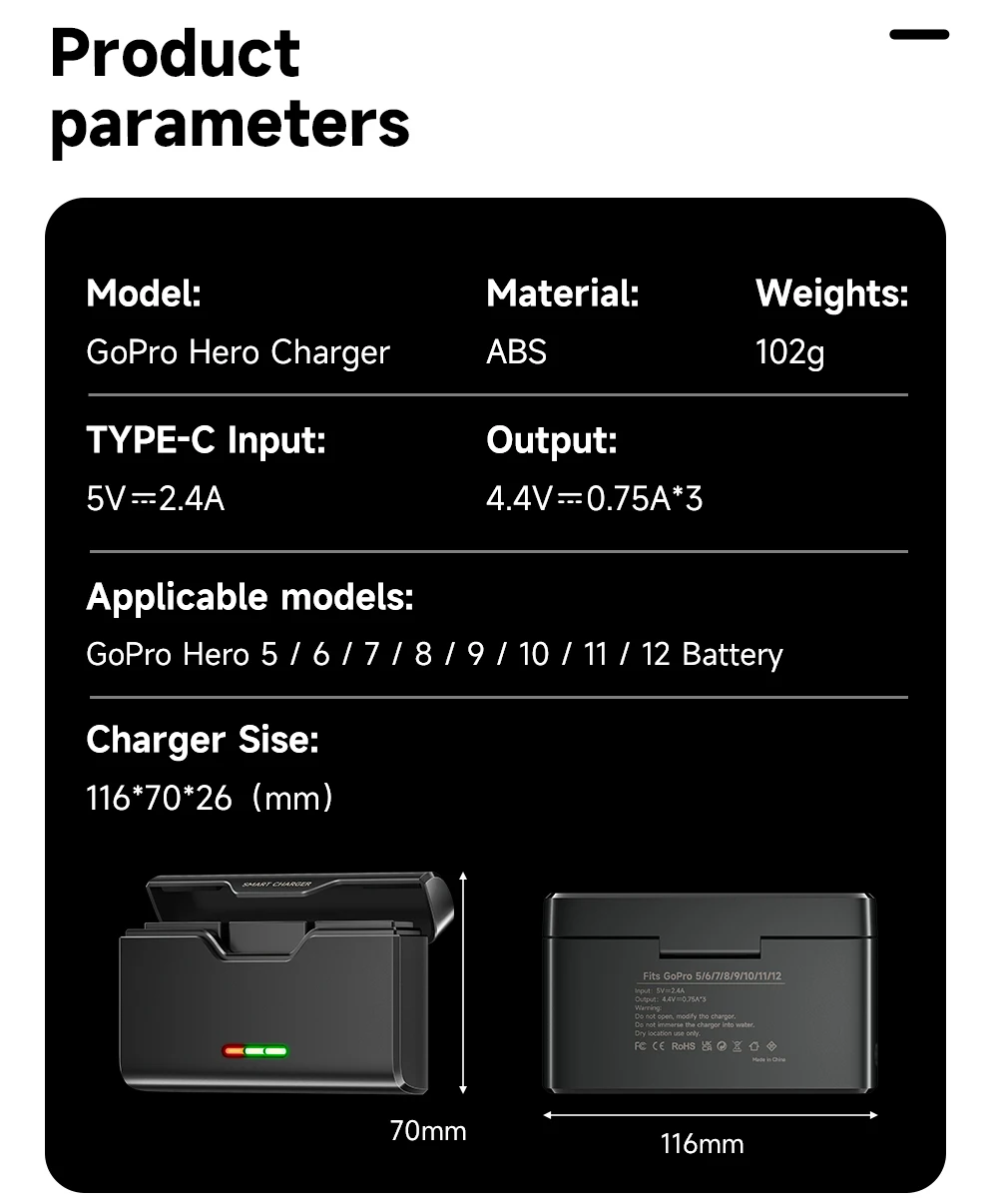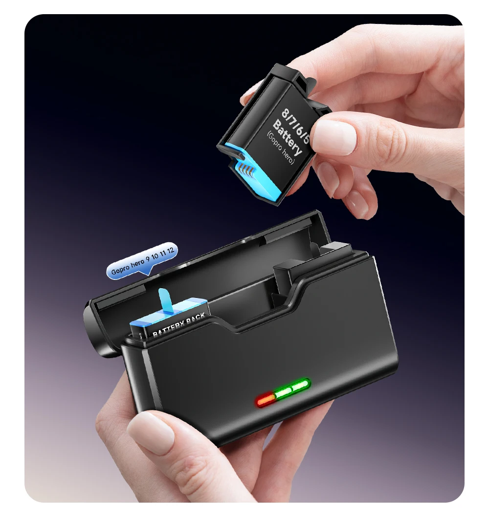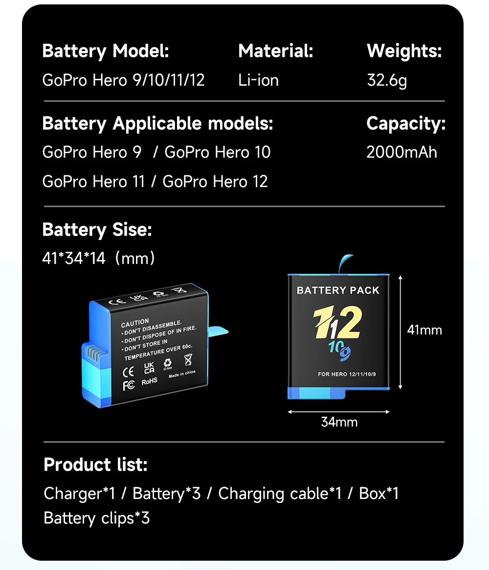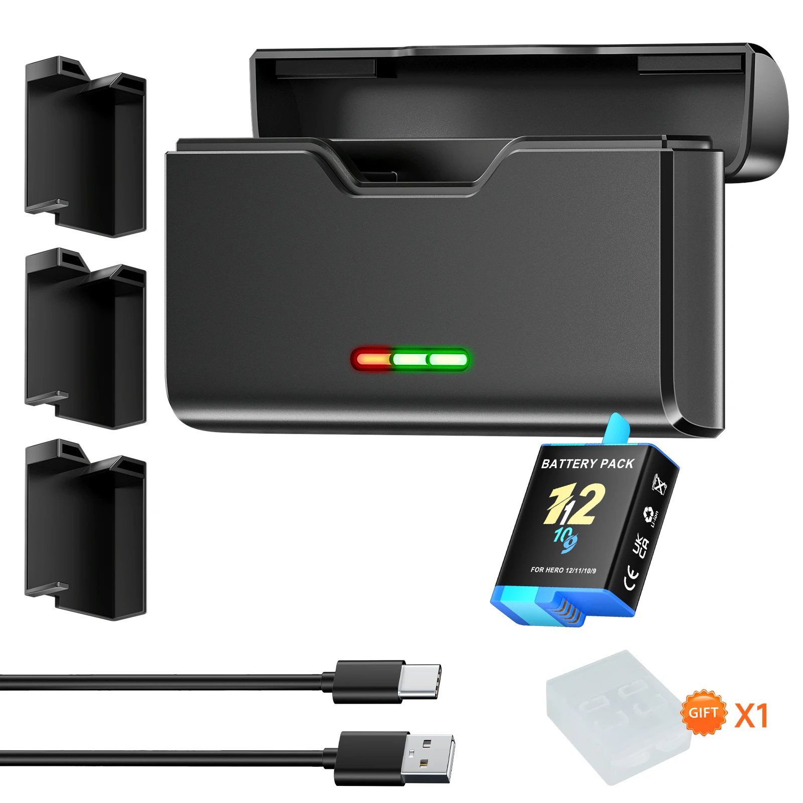 1. يناسب gopro Hero 12/11/10/9/8/7/6/5، ويمكن شحن 3 بطاريات في المرة الواحدة.