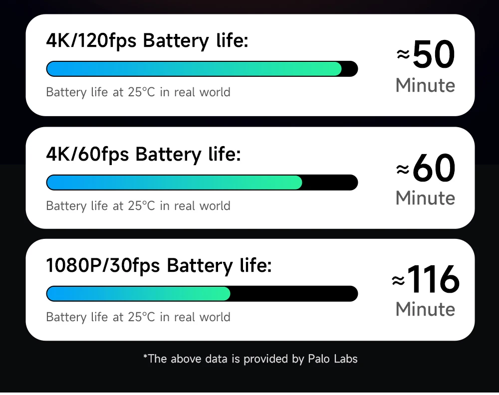 وقت التصوير 3.4K/120 إطارًا في الثانية حوالي 50 دقيقة، ووقت التصوير 4K/60 إطارًا في الثانية حوالي 60 دقيقة، ووقت التصوير 1080/30 إطارًا في الثانية حوالي 116 دقيقة.