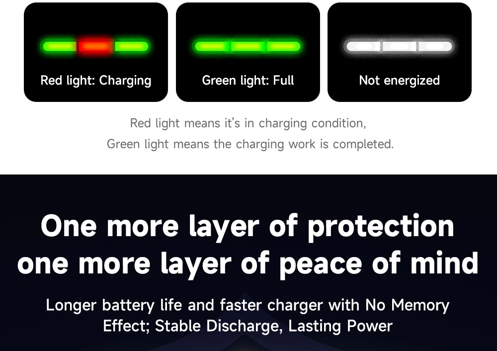 5. البطارية كاملة هي الضوء الأخضر، بالقرب من الضوء الأصفر الكامل، والاستعداد هو الضوء الأزرق.