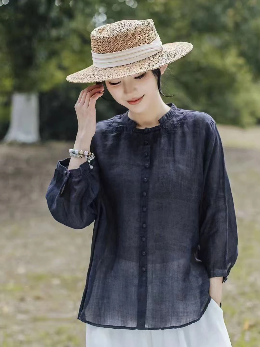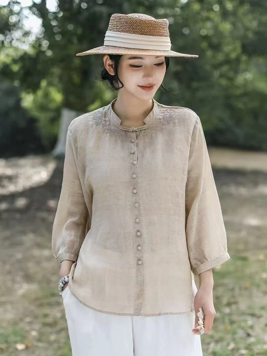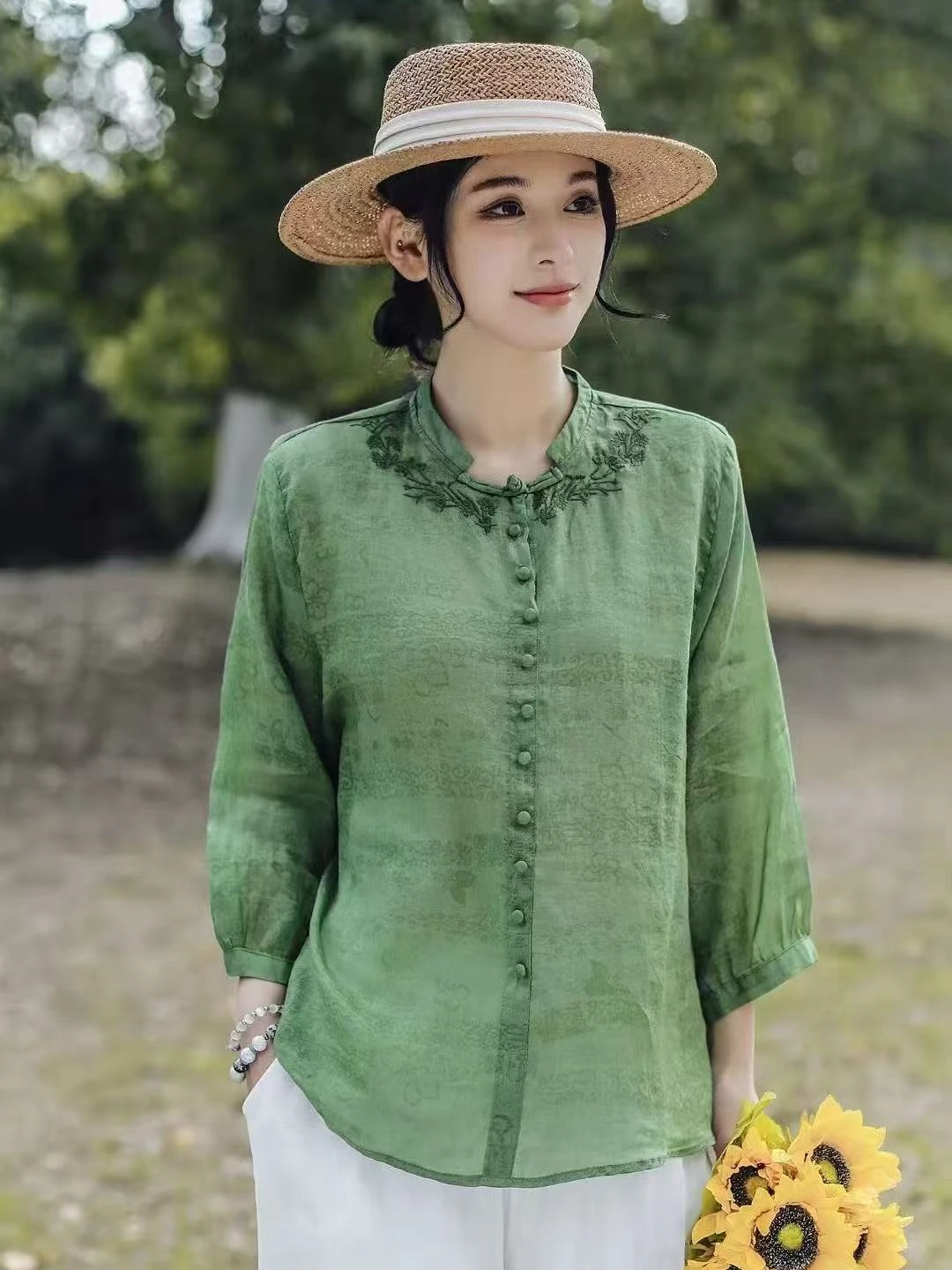 Elegant Harajuku Slim Fit Female Loose Casual All Match Tops Women embroidery Button Three Quarter Sleeve Blouses