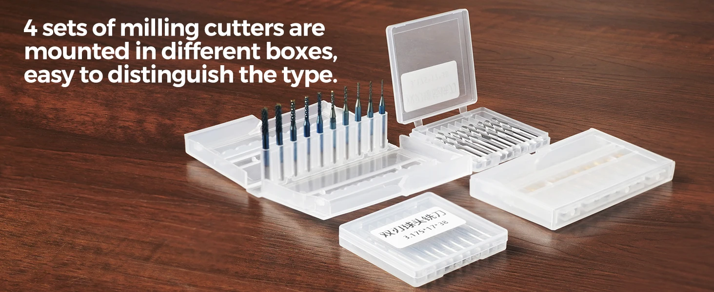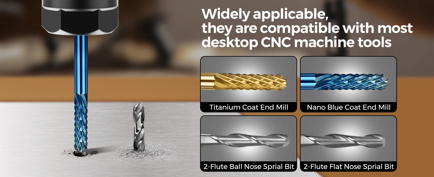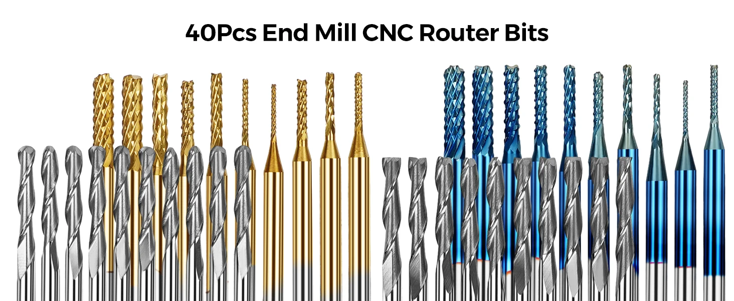 【Cost-Effective Kit】4 Type Each 10Pcs, Ball Nose Bit 2-Flute, Flat Nose Spiral Bit 2-Flute, Nano Blue Coat and Titanium Coat CNC Router Bits, satisfying your different needs.
