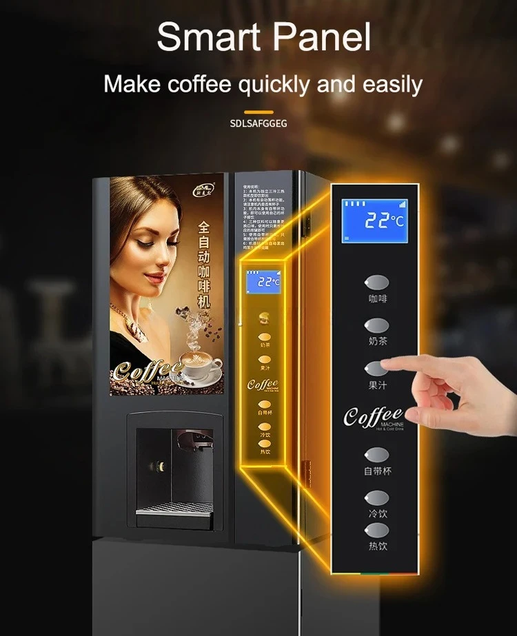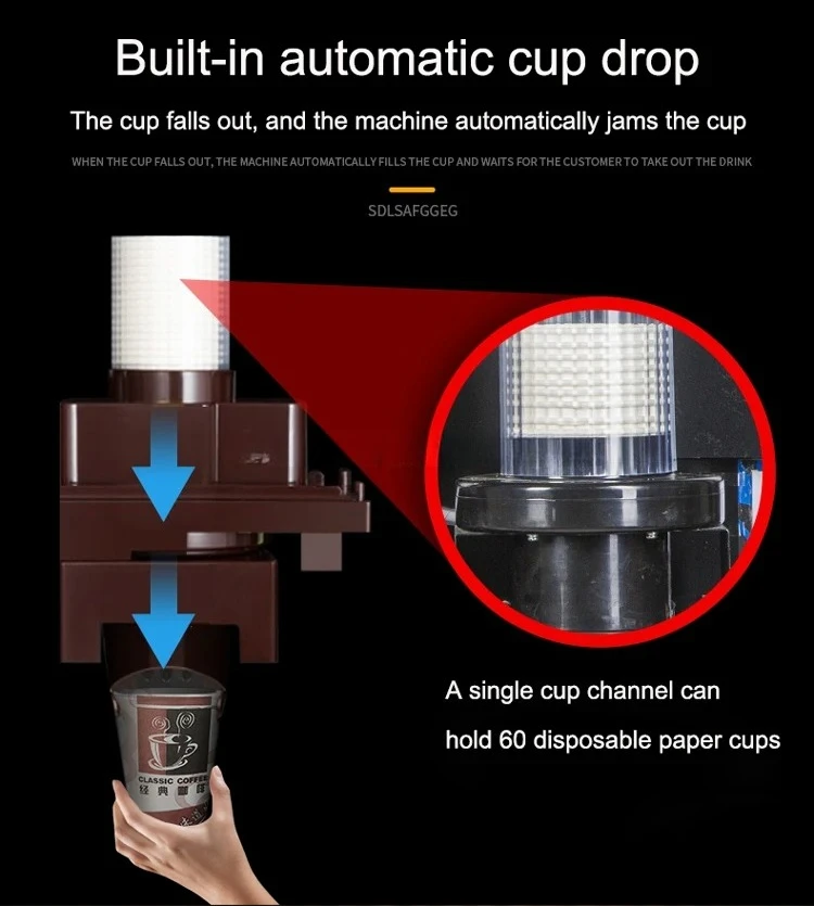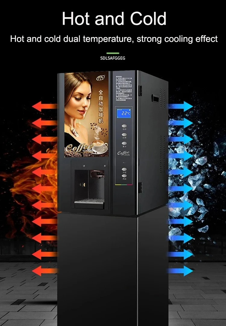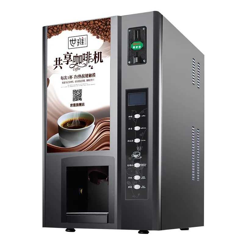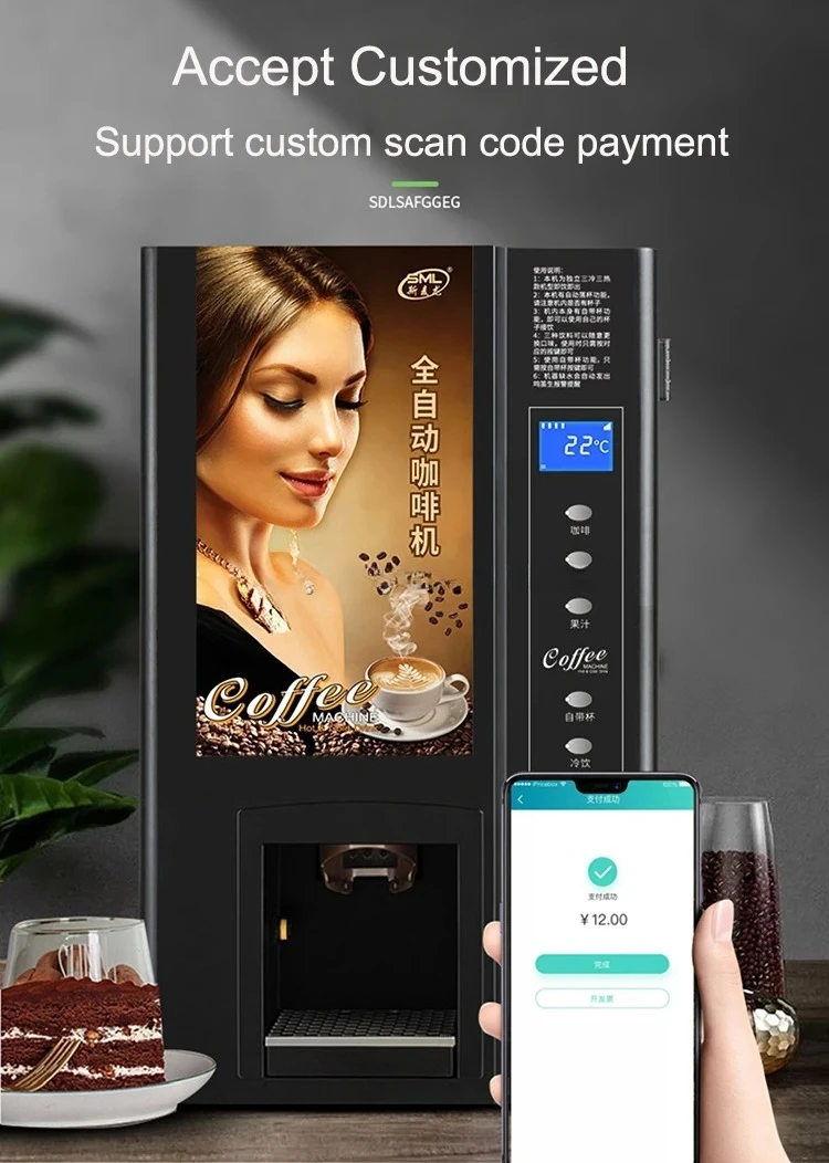 ماكينة بيع القهوة التجارية 6 في 1، اسبريسو/كاكاو/شاي أوتوماتيكية مع نظام الدفع، تقنية الألومنيوم الذكية الكهربائية