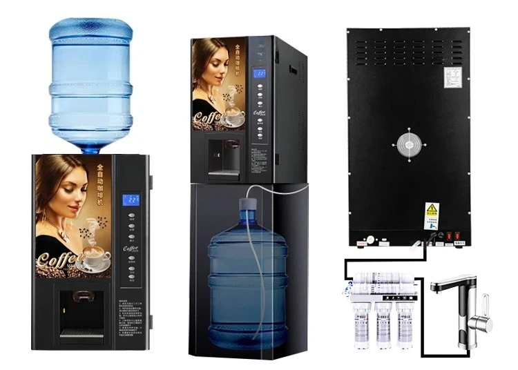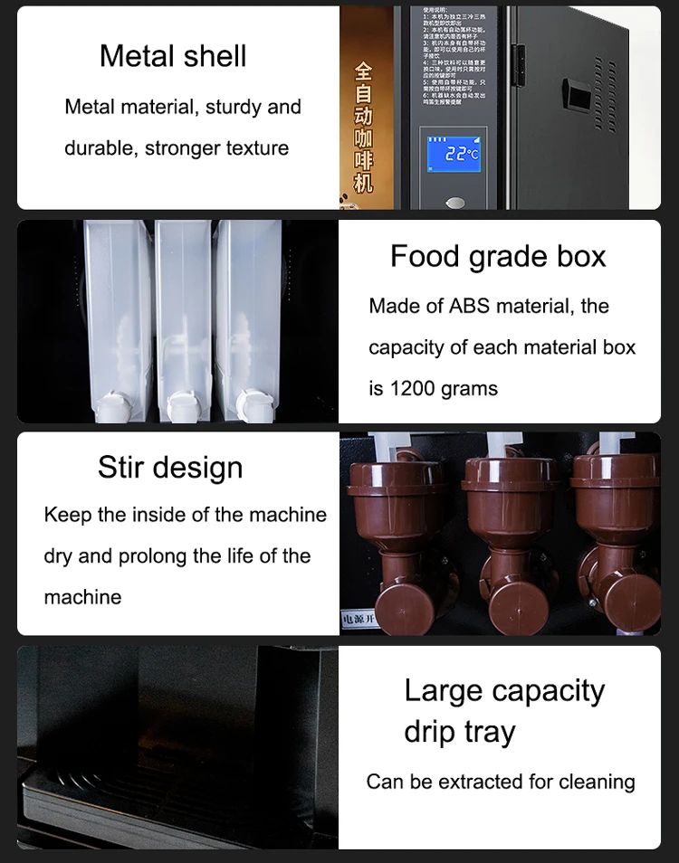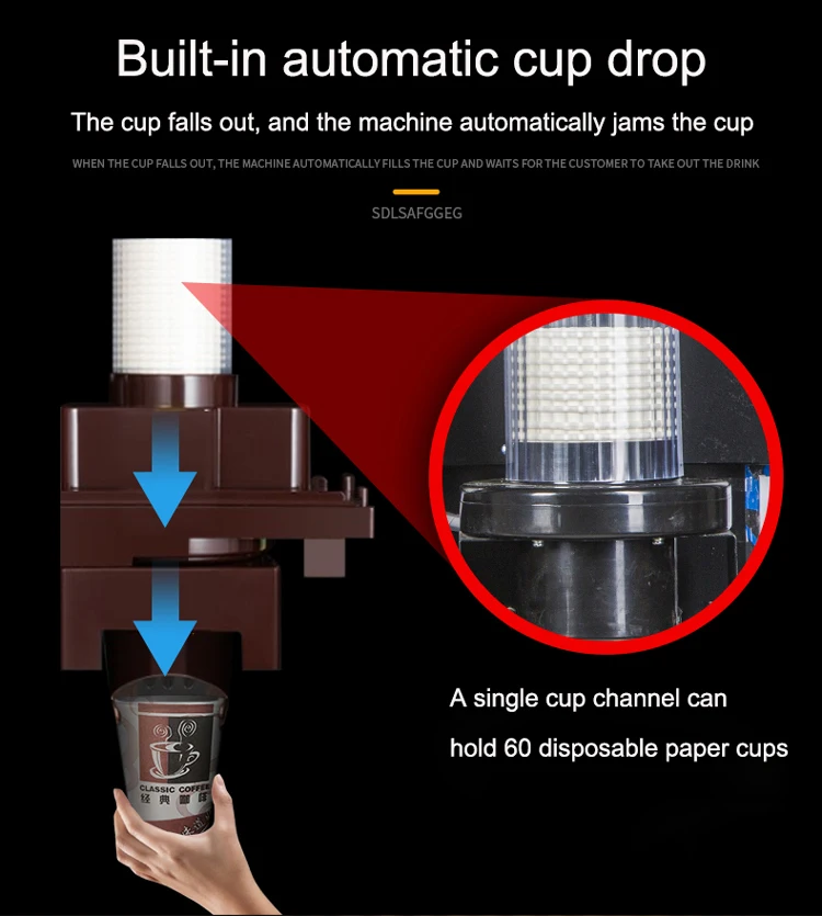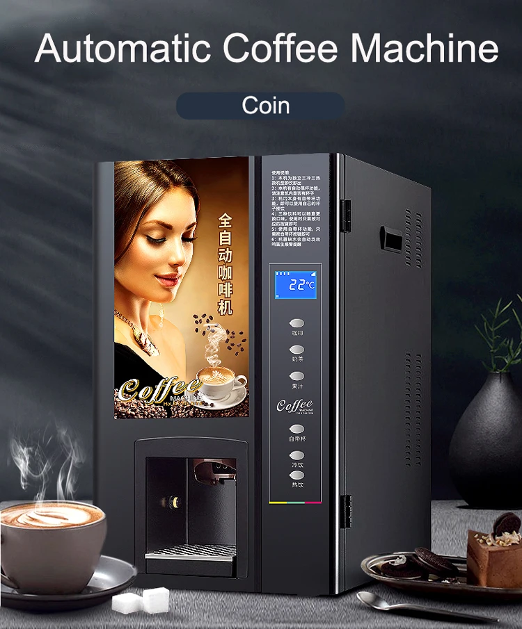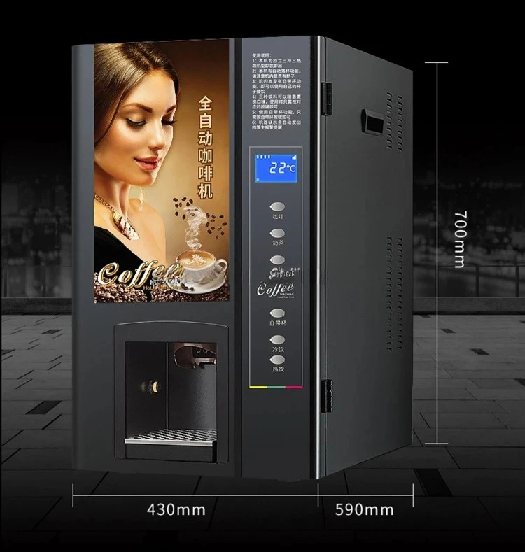 ماكينة بيع القهوة التجارية 6 في 1، اسبريسو/كاكاو/شاي أوتوماتيكية مع نظام الدفع، تقنية الألومنيوم الذكية الكهربائية