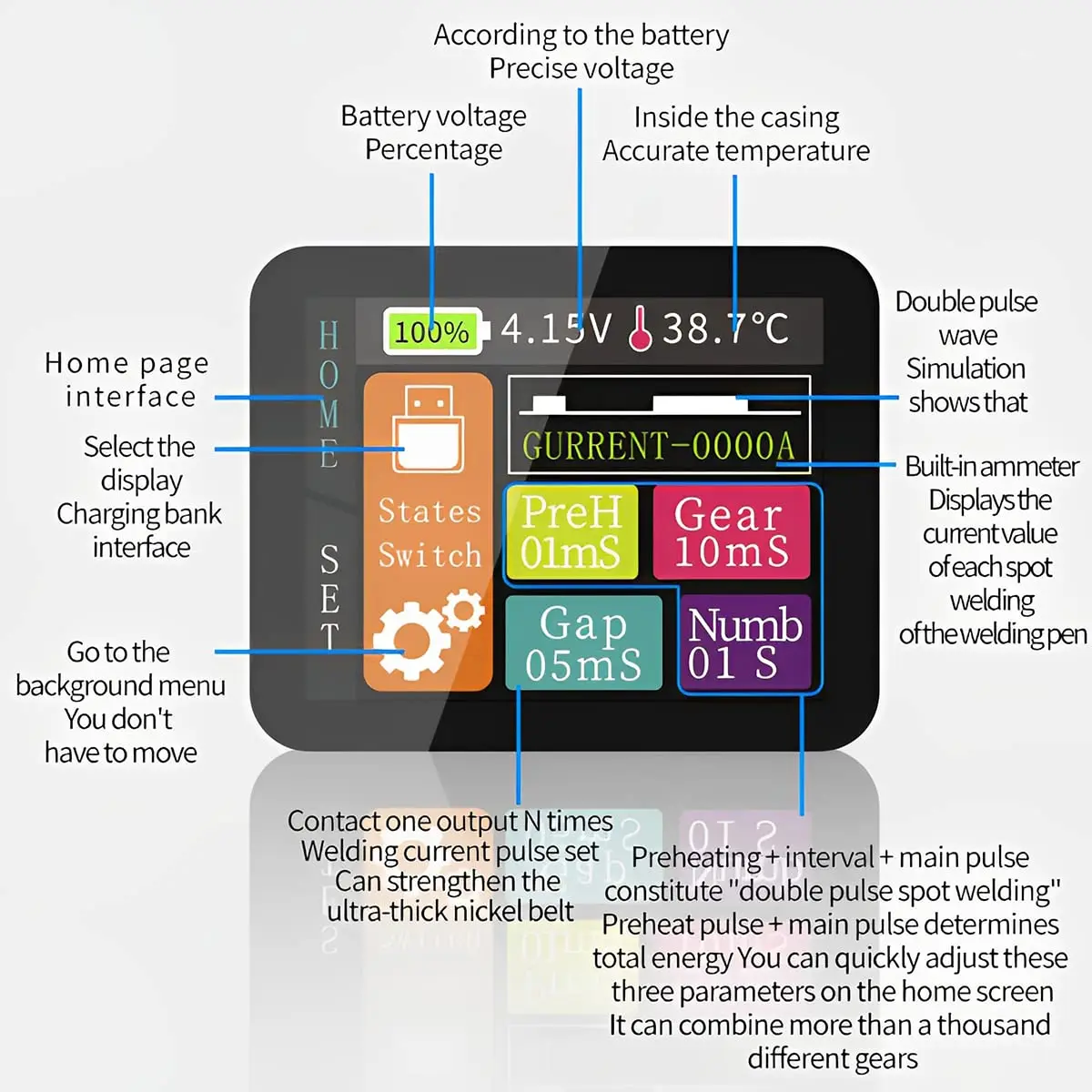 【مع شاشة LCD ملونة】تم تجهيز ماكينة لحام البقعة الصغيرة لدينا بشاشة LCD ملونة مرئية، حتى تتمكن من رؤية البطارية المتبقية بوضوح، وتأخير الوقت، ودرجة الحرارة، وترس ماكينة لحام البقعة.وسوف تزيد الإنتاجية الخاصة بك.