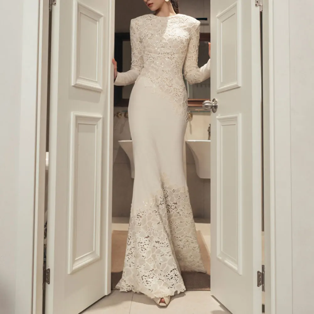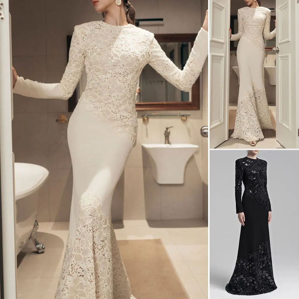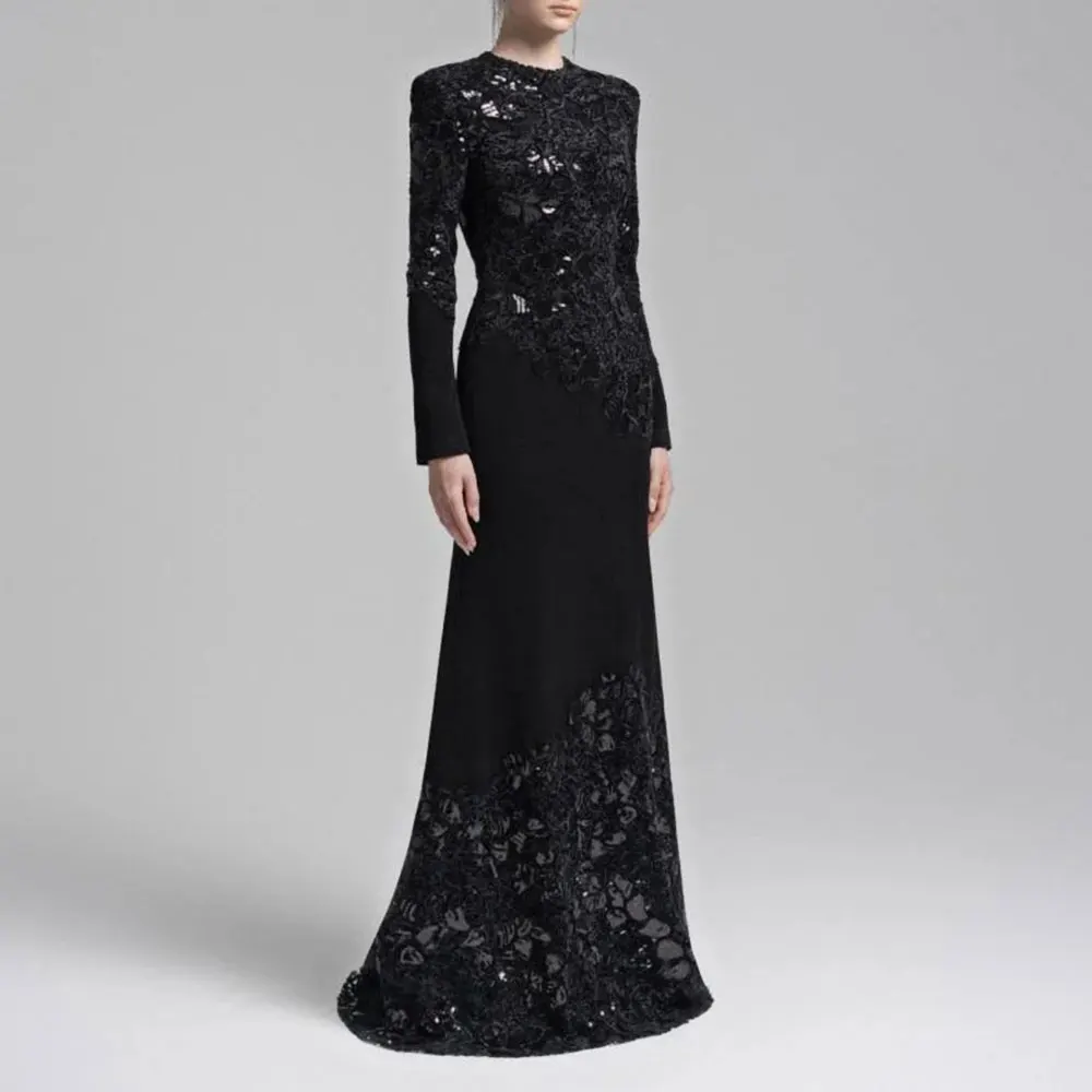 فستان طويل صيفي للسيدات من Rafiah 2025 جاكار عادي حورية البحر بأكمام طويلة ورقبة دائرية وفتحة حتى فستان