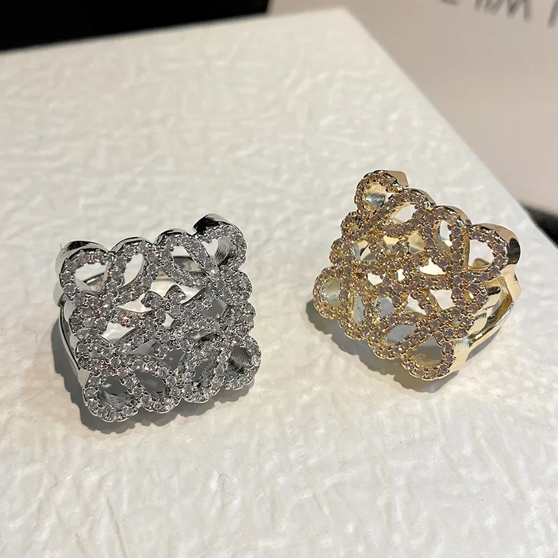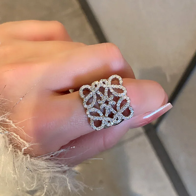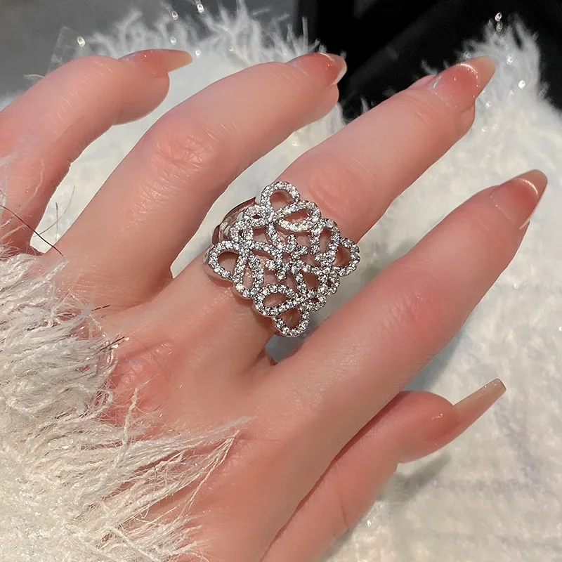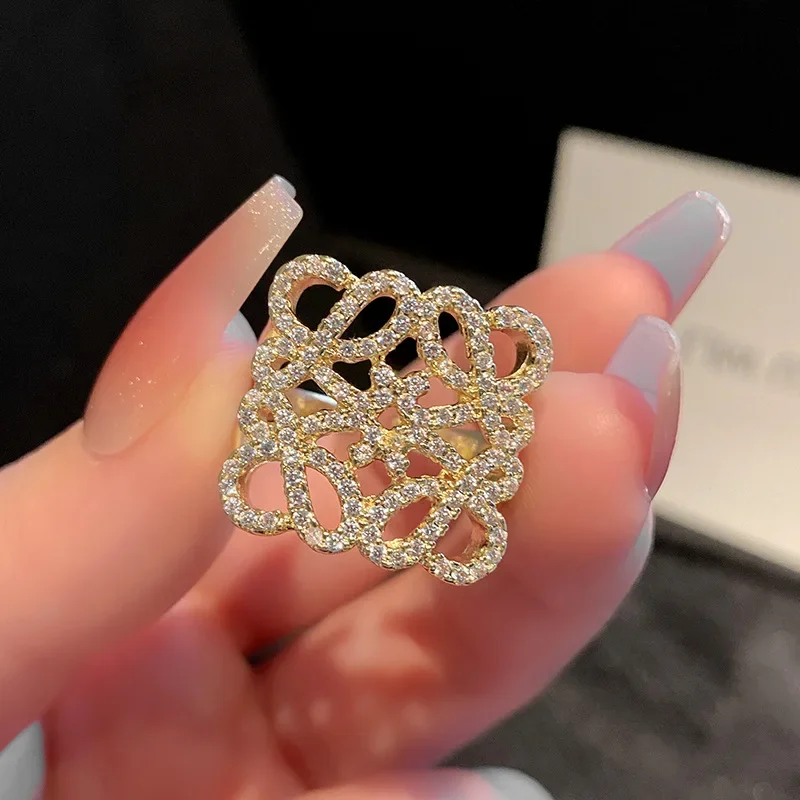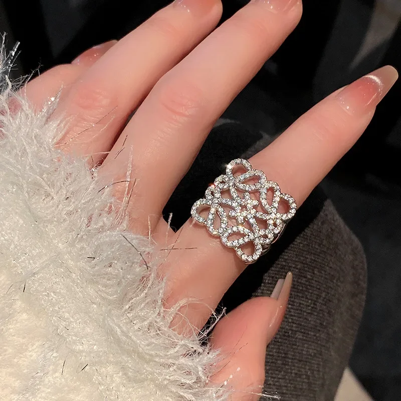 Geometric Hollow out Metal Diamond Ring Versatile Fashionable Luxury Sensation Small Fragrance Style Elegant Band Ring